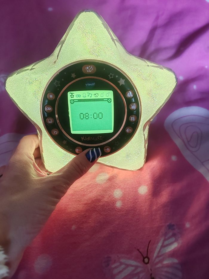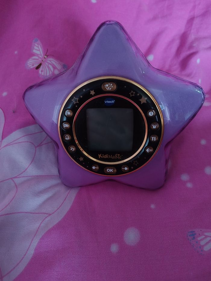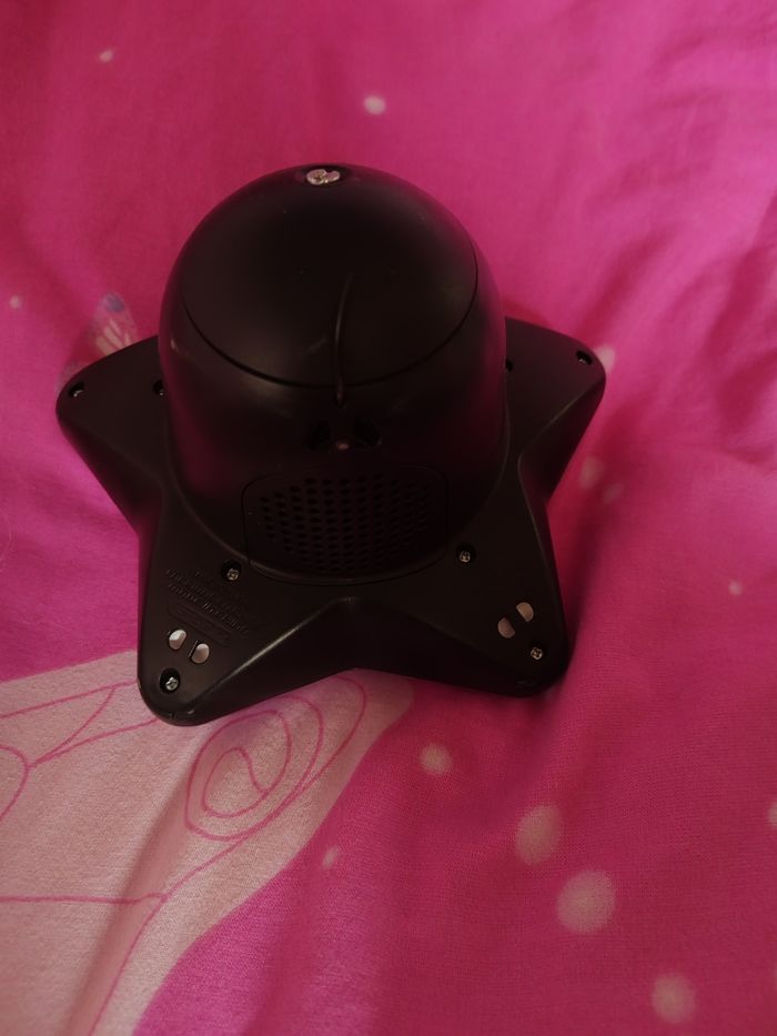 Réveil magique 9 en 1 qui change de couleur avec projection animée au plafond en très bon état fonctionne avec pile ou possibilité filaire câble non fourni * Réveil * Projection de l 'heure * Étoile lumineuse * Horloge parlante * Mélodies Relaxantes * Radio * Voyance Magique * Jeux * Enceinte pour lecteur MP3