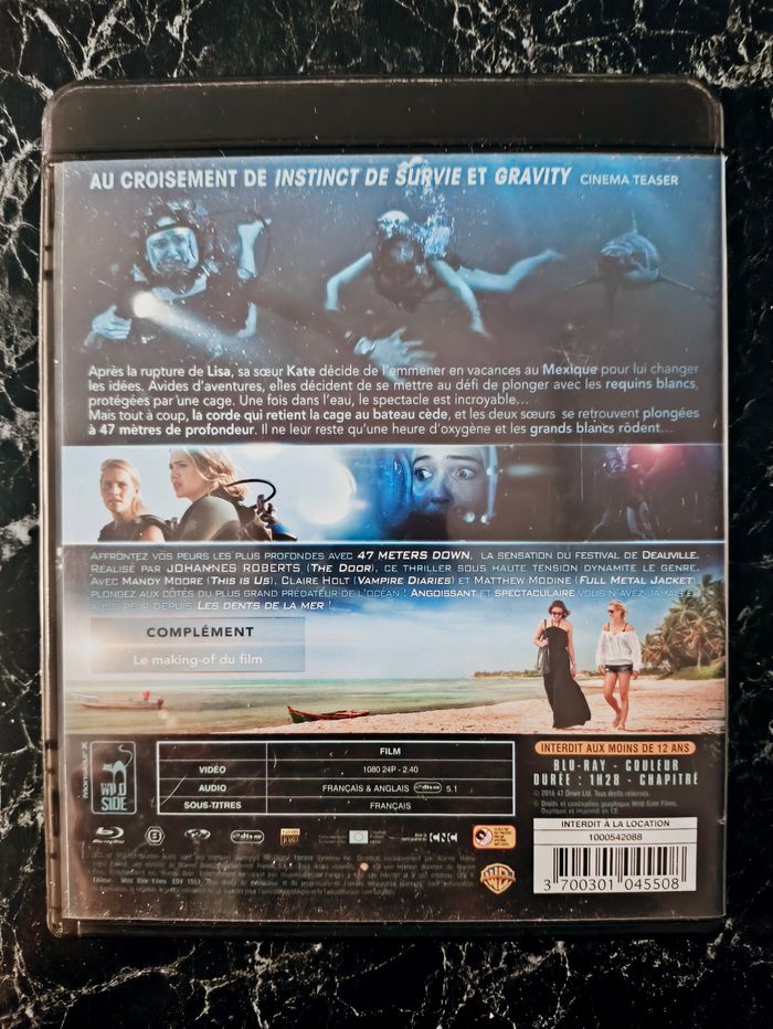 Film 47 Meters Down (2017) en très bon état. Thriller et survie de Johannes Roberts avec Mandy Moore, Claire Holt, Matthew Modine, Yani Gellman et Santiago Segura. Plusieurs autres films (DVD et blu-ray) et séries télé disponibles sur mon dressing. Si vous avez des questions ou souhaitez plus de photos, n'hésitez pas à me demander. Prix négociable seulement si vous achetez plusieurs articles. N'hésitez pas à créer un lot et à faire une proposition raisonnable et à me demander un prix. Tag de recherche : #neboo_video #neboo_bluray #neboo_film blu ray bluray langue français française French FR