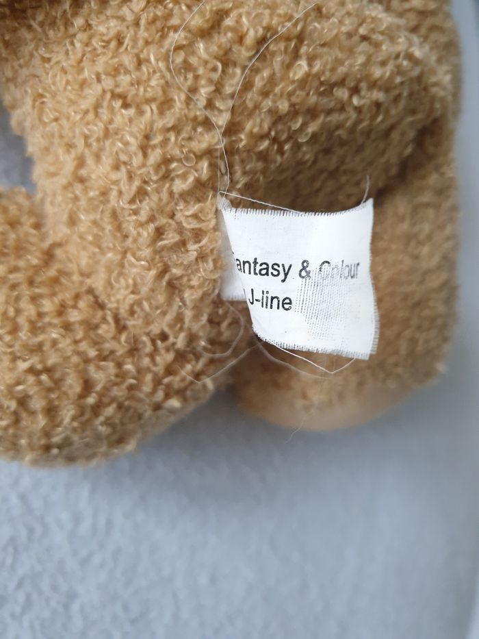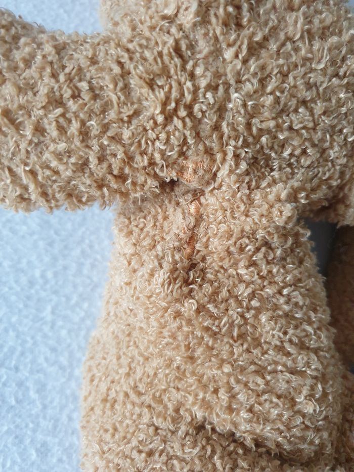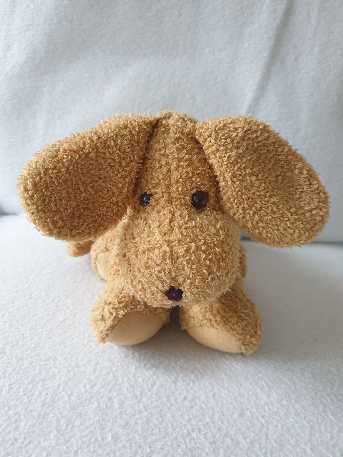 Chien en peluche. Mou et avec des perles dans les pattes pour être lesté. Il mesure environ 30cm de long et 20cm de haut. Il a été recousue sous le ventre (voir photo).