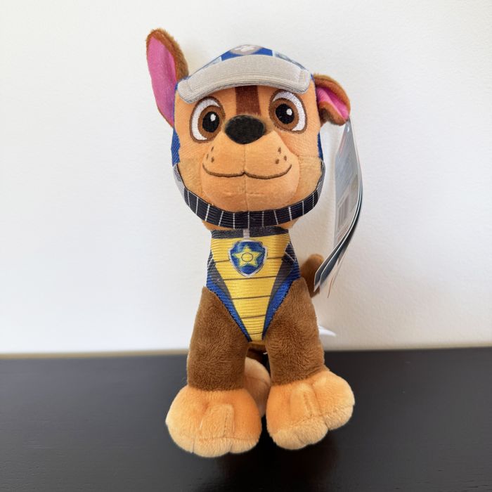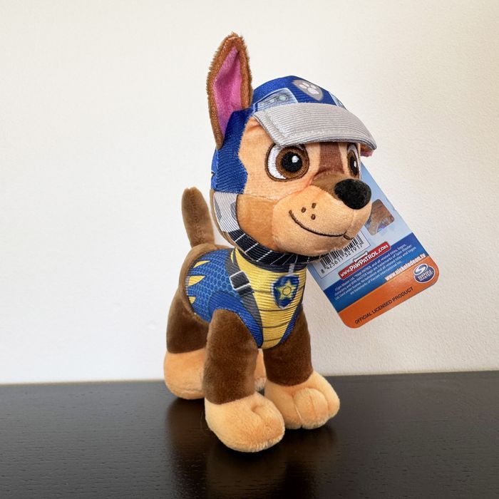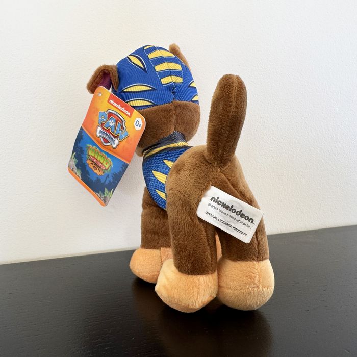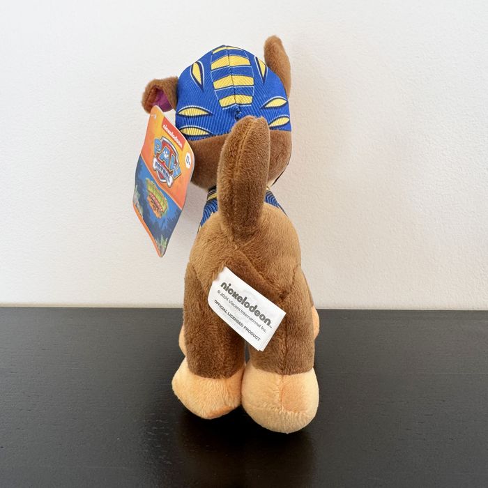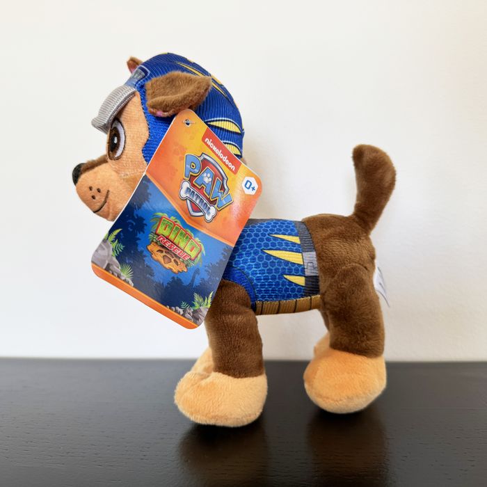 Peluche de Chase avec sa tenue de Mission Dino sous licence officielle, conçue par le fabricant Play by Play. Elle mesure environ 19cm de hauteur.