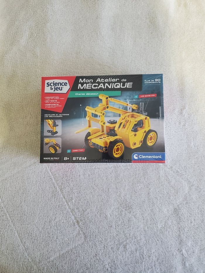 Boite NEUVE Sous blister Mon atelier de mécanique Chariot de marche Marque clemenroni Clementoni Jouets Mécaniques - Science et Jeu Chariot élévateur en kit Avecjouet mécanique en kit de Clementoni, les enfants plongent de manière ludique dans le monde passionnant de la technique ! Le chariot élévateur de la série Science et Jeu permet d'apprendre de manière amusante comment fonctionnent les machines. L'assemblage stimule la pensée logique et la créativité et les pièces en plastique robustes garantissent un plaisir de jeu durable. Une fois construit, le chariot élévateur peut réellement rouler et le mécanisme de levage peut être actionné. Apprendre devient ainsi une aventure ! Convient aux enfants curieux de 8 ans et plus qui aiment construire et découvrir.