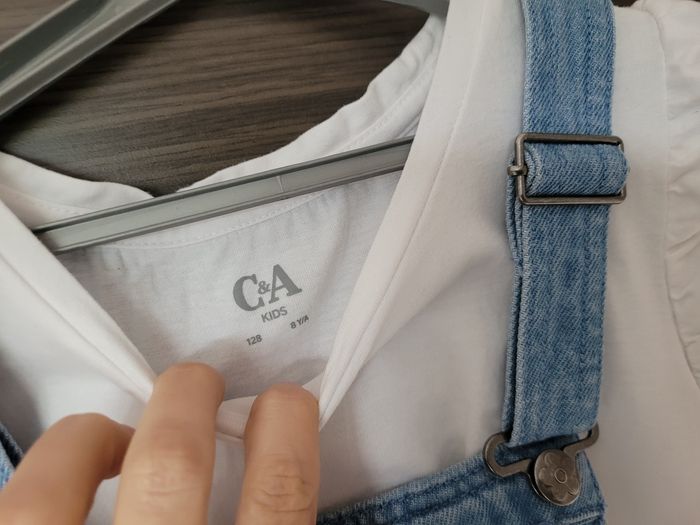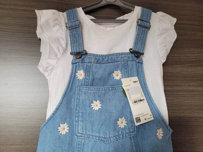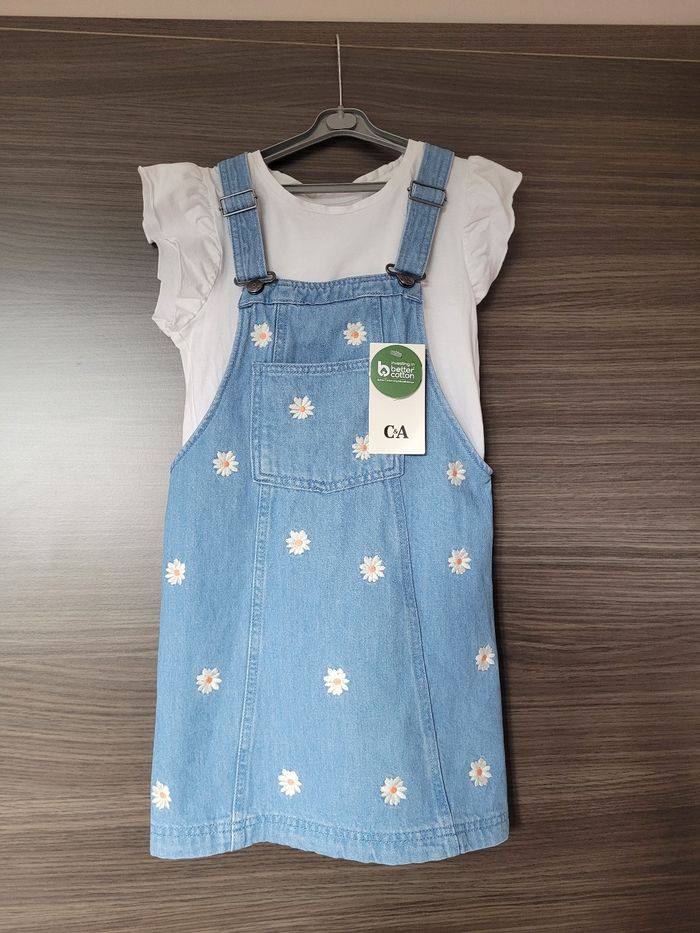Ensemble c&a 8 ans 128 cm Neufs avec étiquette Salopette bleu jean, motifs Marguerite T-shirt blanc