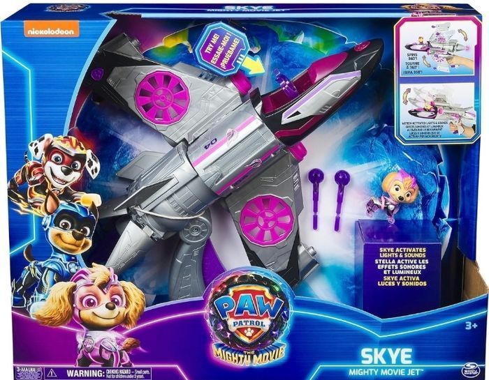 Le véhicule 2 en 1 de Stella de 40 cm qui est la réplique officielle de l'avion de chasse Pat Patrouille que vous pouvez voir dans La Super Patrouille Le Film Sons et lumieres : Clipsez la figurine Stella dans le cockpit de son avion, déplacez-le et pressez le levier pour faire tourner les ailes de son jet et entendre les effets sonores et la musique du film ; Projectiles et 3 piles LR03 inclus Neuf dans son emballage non ouvert