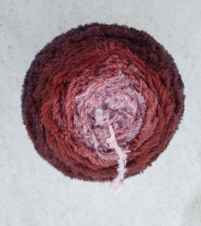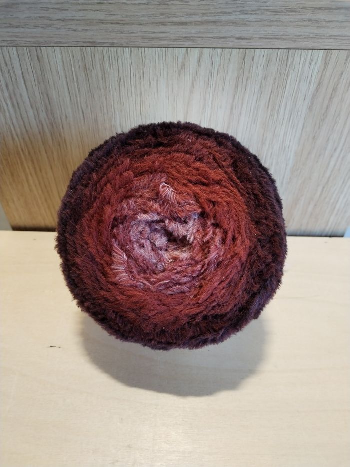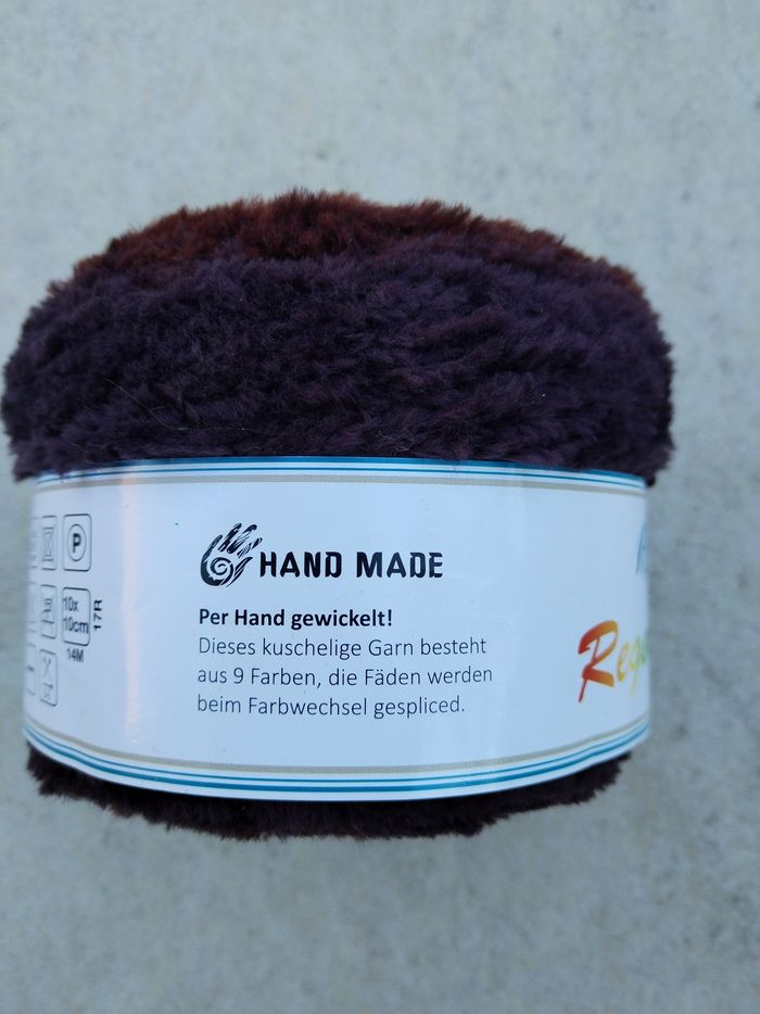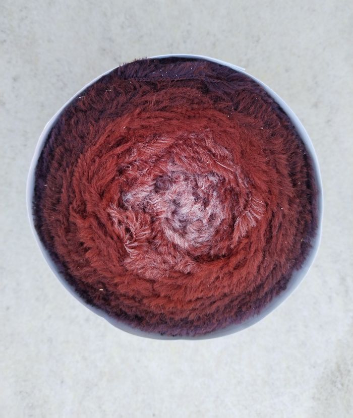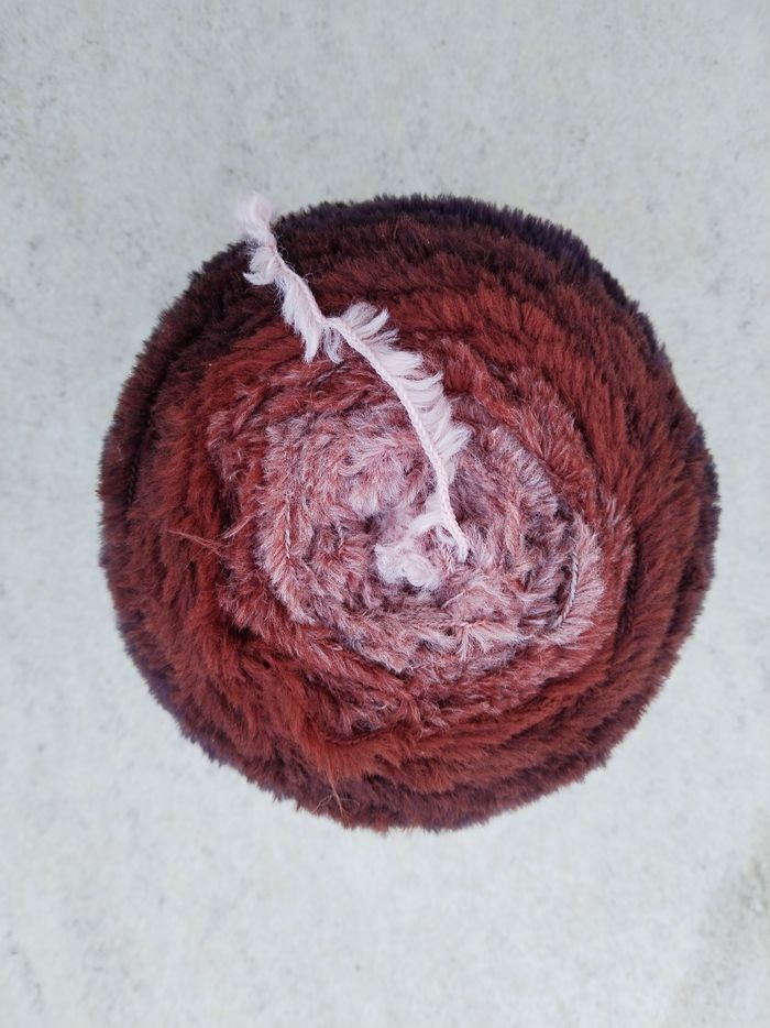 Pelote de Laine sous forme de Cake, laine fil peluche, 250 g env 350 m, 80 % polyamide, 20 % polyester, aiguilles 5-6, joli dégradé multicolore dans les tons marron-rouille, fil peluche tout doux, bien chaud, très agréable au toucher et à porter 👍 pour un châle cosy et cocooning 🤎🤎