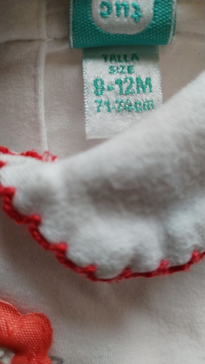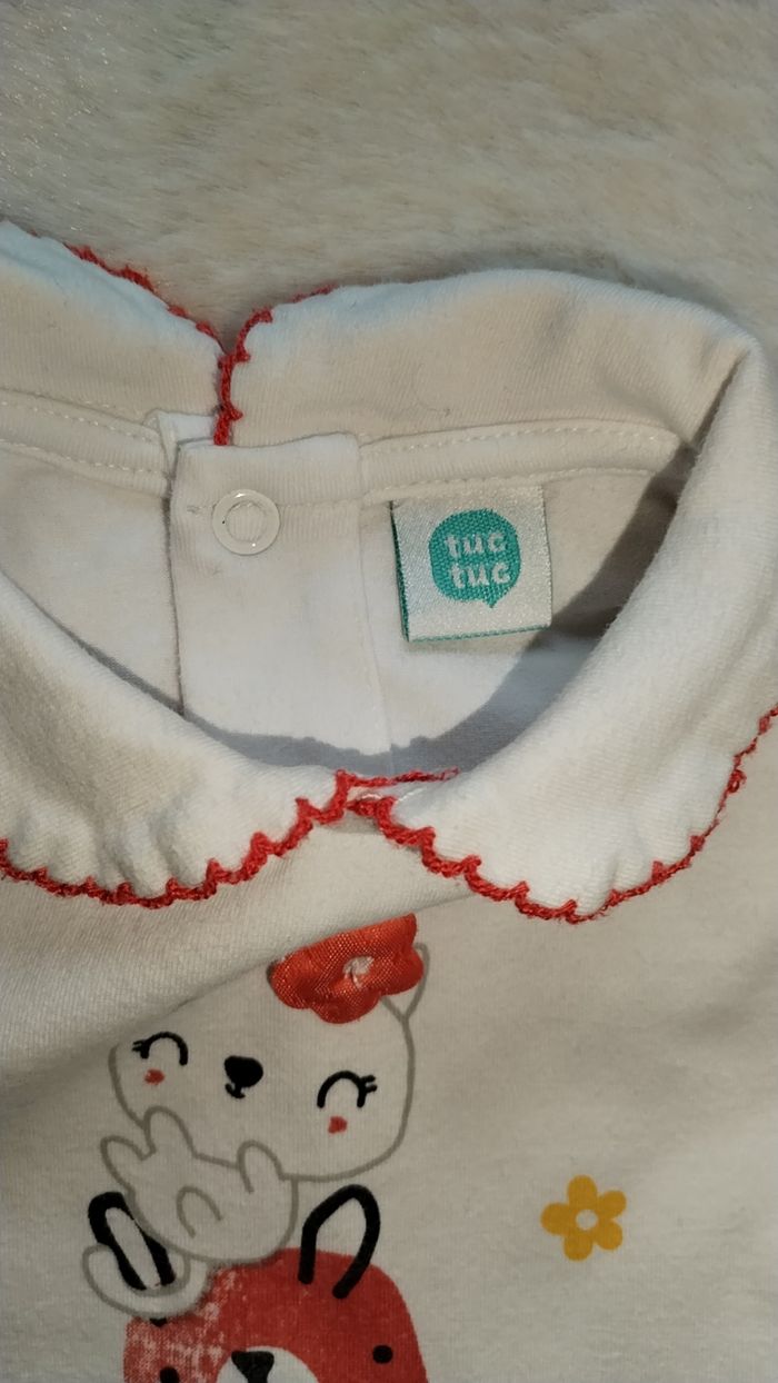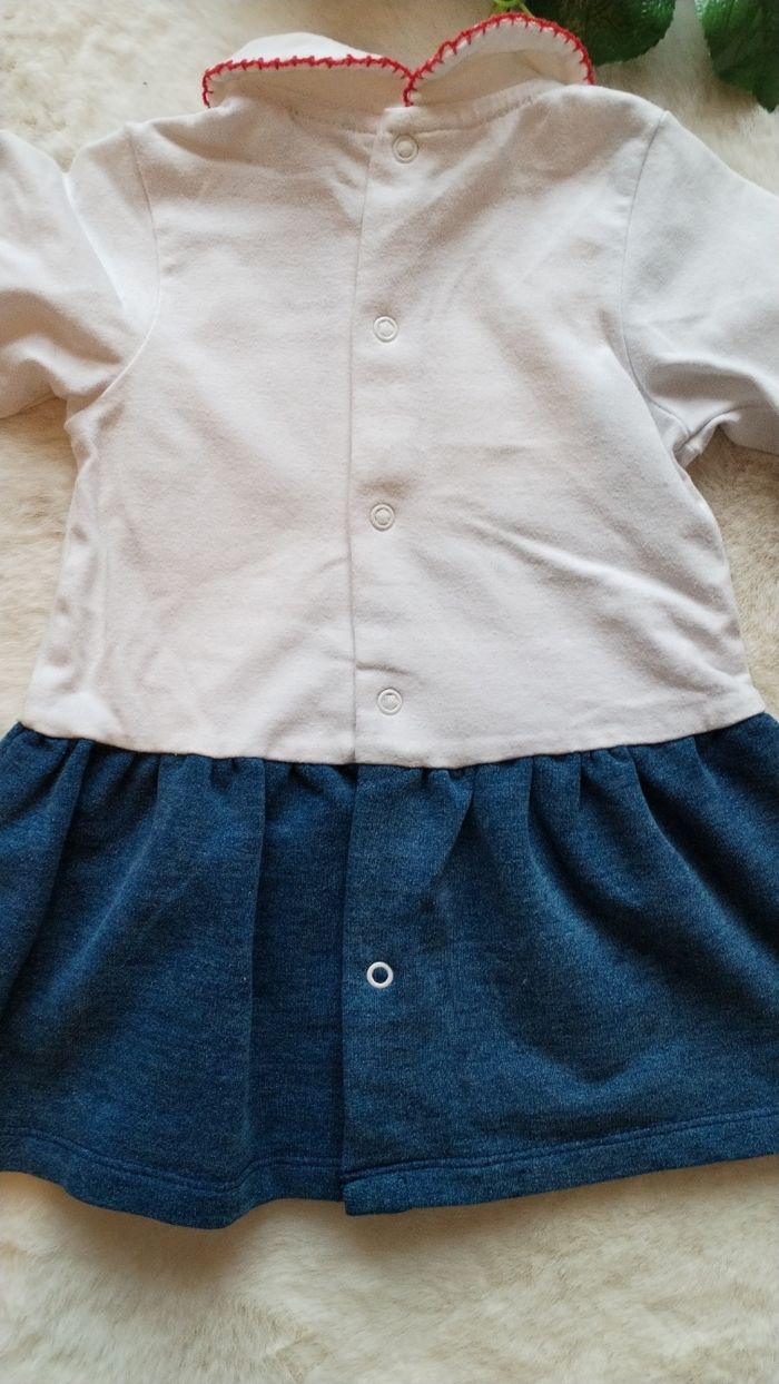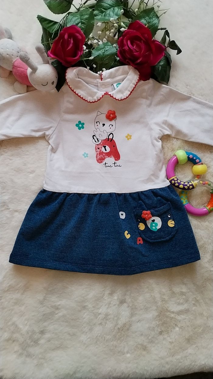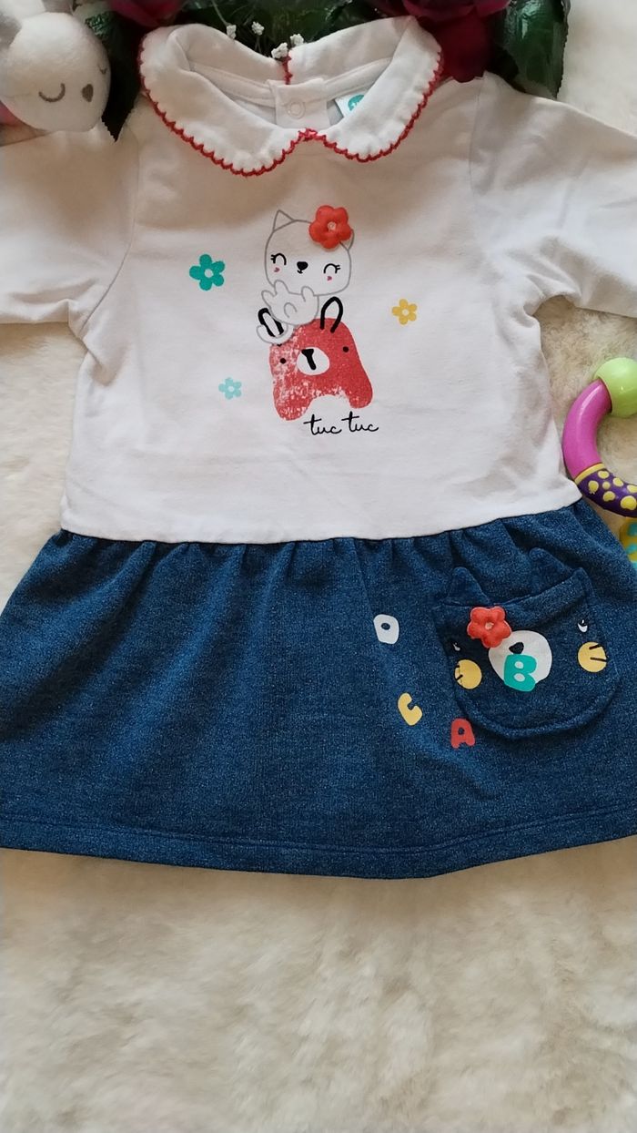 Mignonne robe 2-en-1 avec haut en jersey blanc et col Claudine à bordure rouge festonnée ❤️. Le dessin d'animaux est craquant, avec un petit nœud fleuri ! La jupe en simili jean souple a une poche décorée. Idéale pour le confort et le style de bébé. Très bon état.