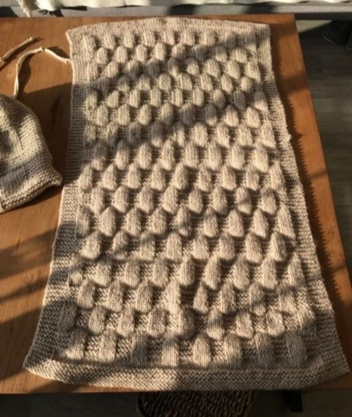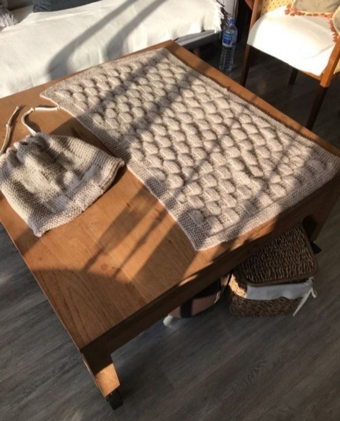 Vends couverture pour bébé avec sa pochette fait main au tricot. Laine de la marque Bergère de France. Couleur sable blanc. L 97 cm - l 55 cm Jamais servie. Prix 50 euros À récupérer sur place ou envoi Mondial Relay