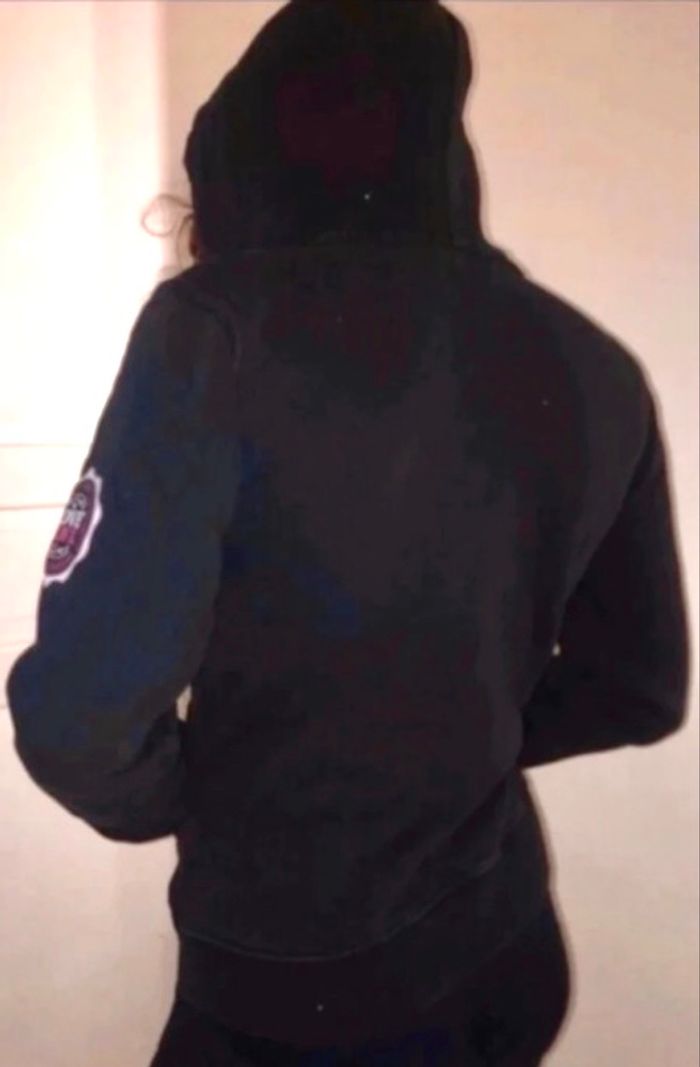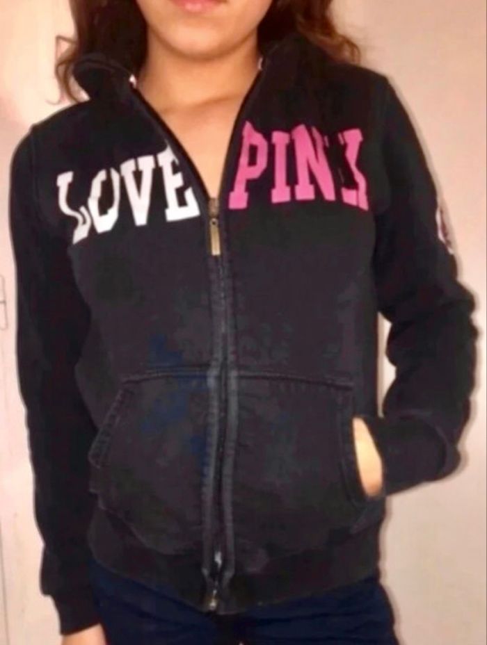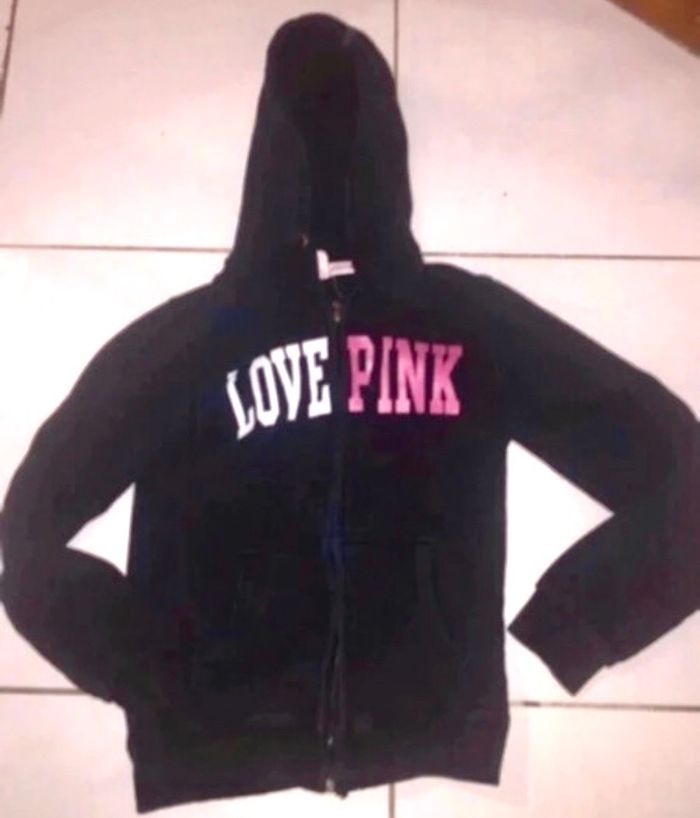 Veste de sport couleur noir blanc et rosé taille 14 ans écrit love pink avec capuche et poche bon état