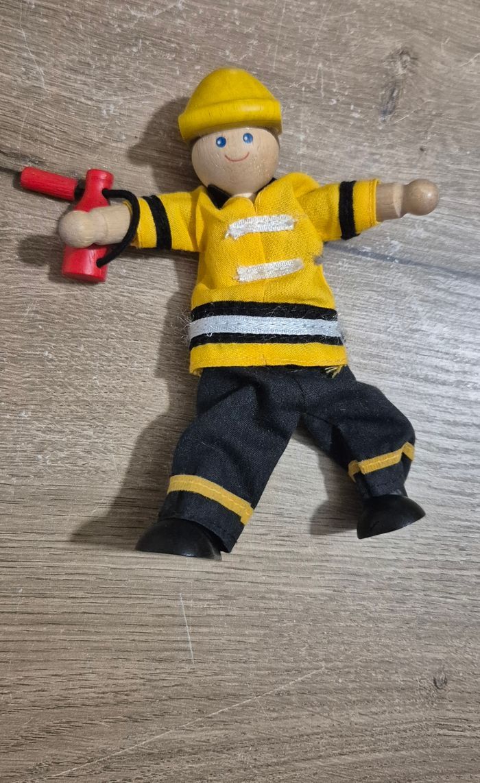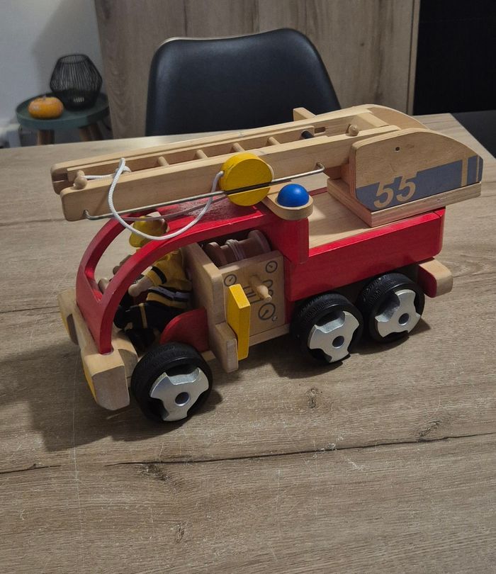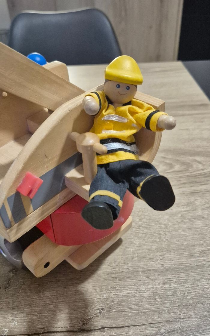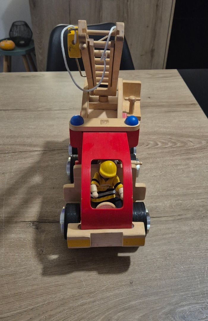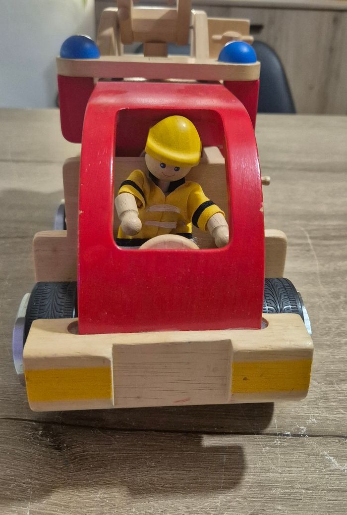 Grand camion de pompier en bois naturel avec personnage Dimensions : 35x15,5x20cm Plan Toys réf n°6310 Très bon état