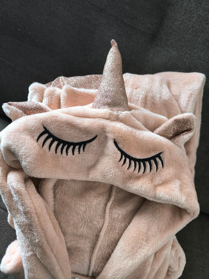 Capuche avec corne pailletée, oreilles et yeux brodés 🦄✨