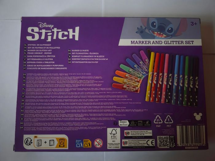 Set feutres et paillettes Stitch Contient : 7 feutres et 12 paillettes