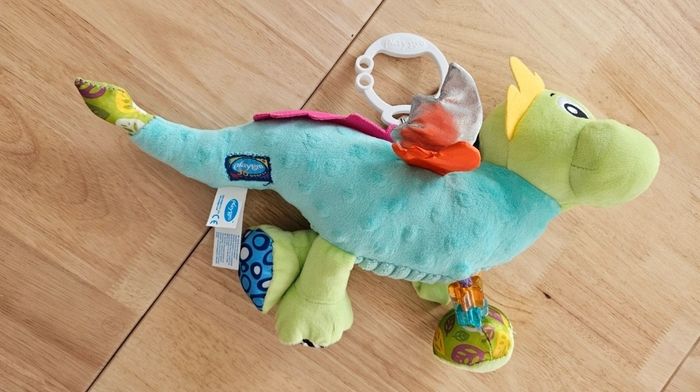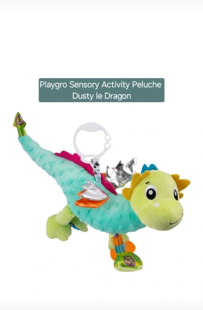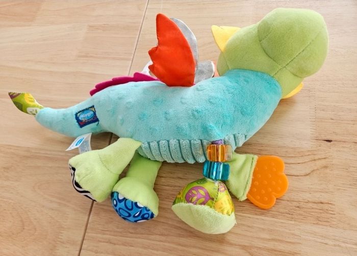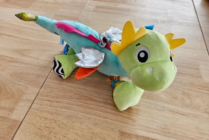 Il intègre des éléments variés comme des textures différentes (fourrure douce, velours côtelé, tissu métallique), des ailes crépitantes, un hochet, des perles et un anneau de dentition pour apaiser les gencives.
