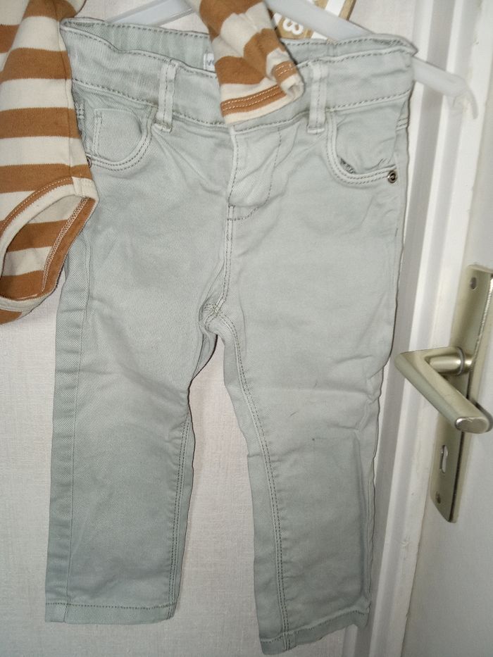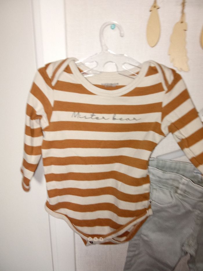 Lot composé d'un body rayé , d'un gilet présentant une tâche et un jean clair avec une trace de stylo.