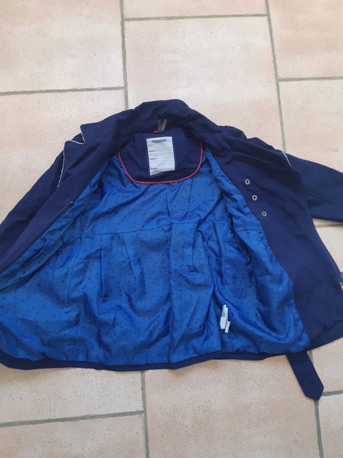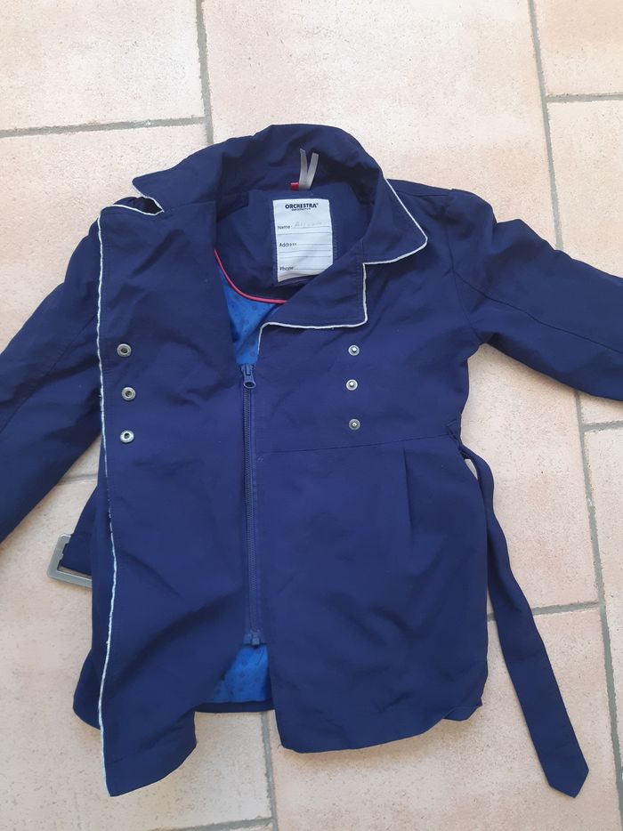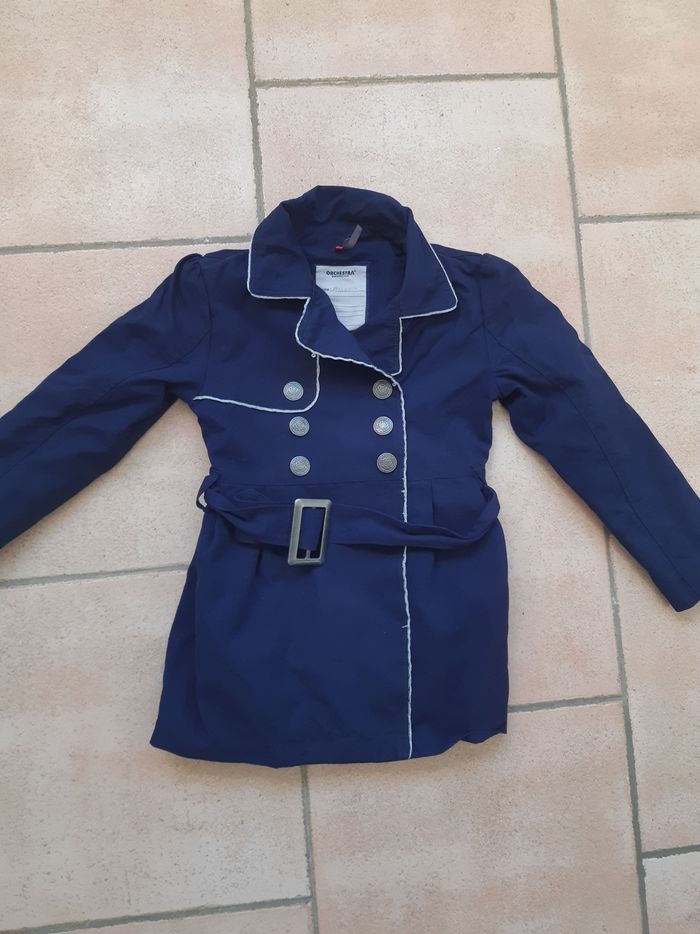 Trench coat fille taille 6 ans marque Orchestra, couleur bleu marine, fermeture eclaire et bouton pression + veste marque Okaidi couleur bleu marine, fermeture par boutons pression, en parfait état 4 euros Envoi rapide et soigné