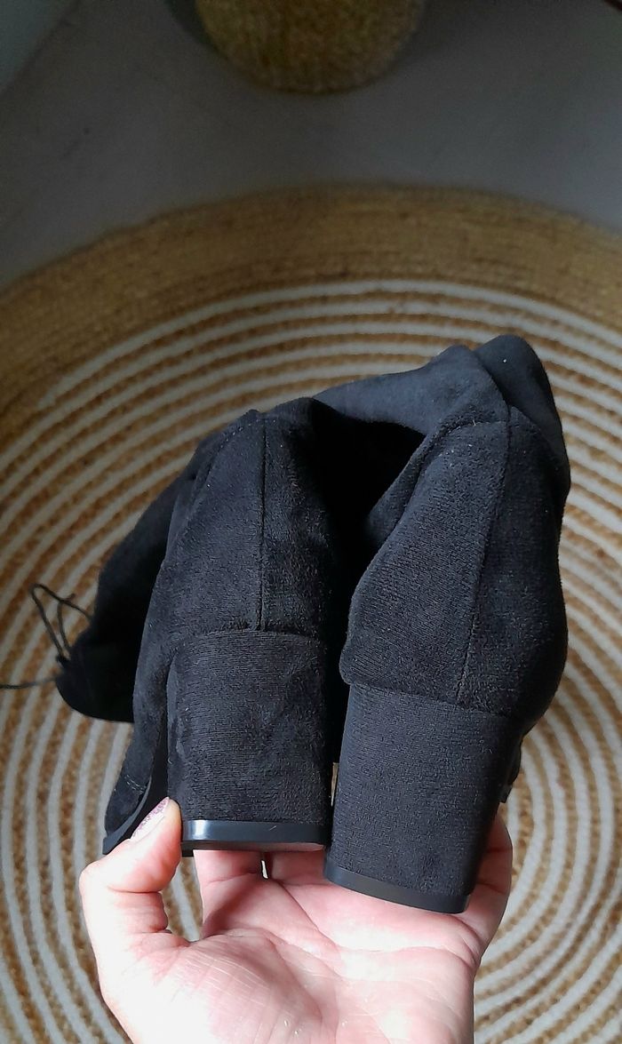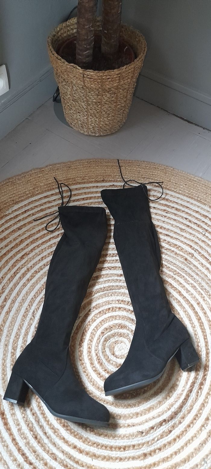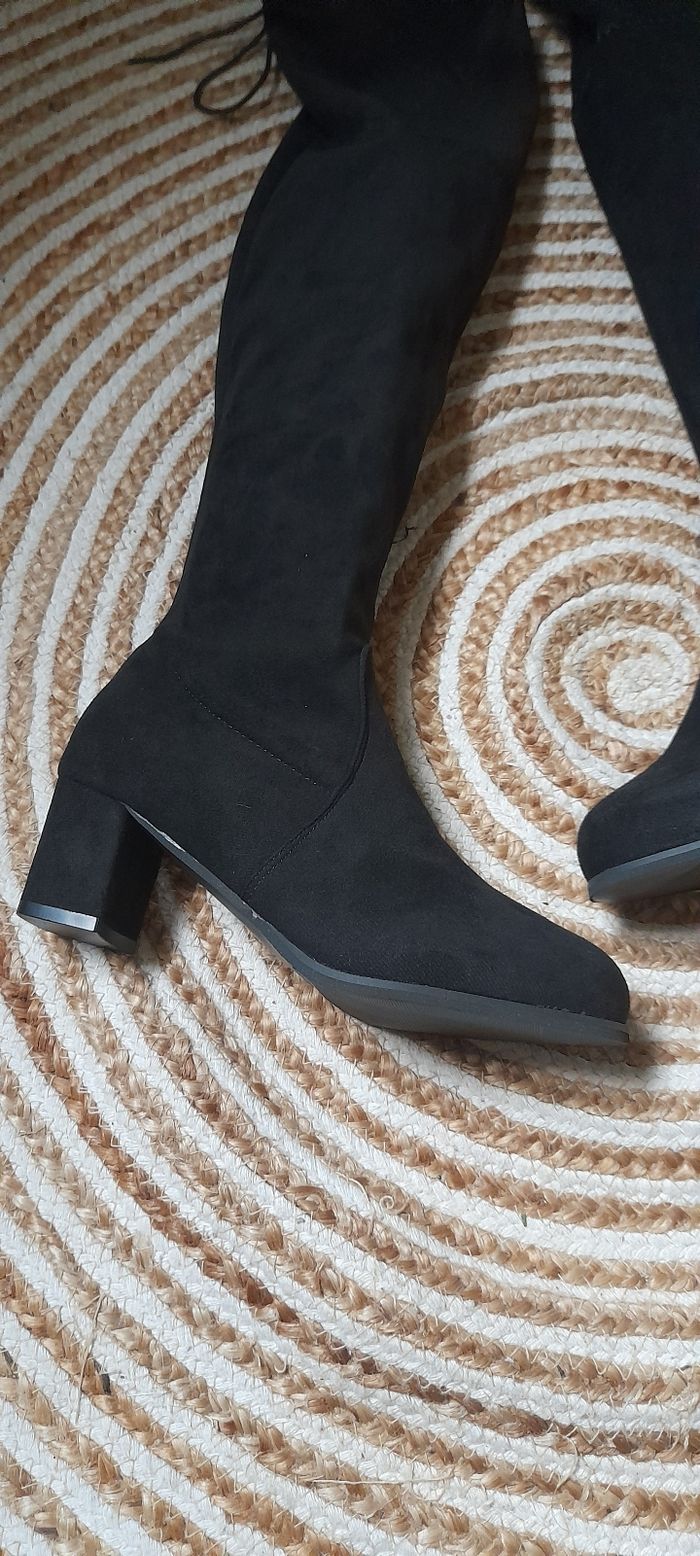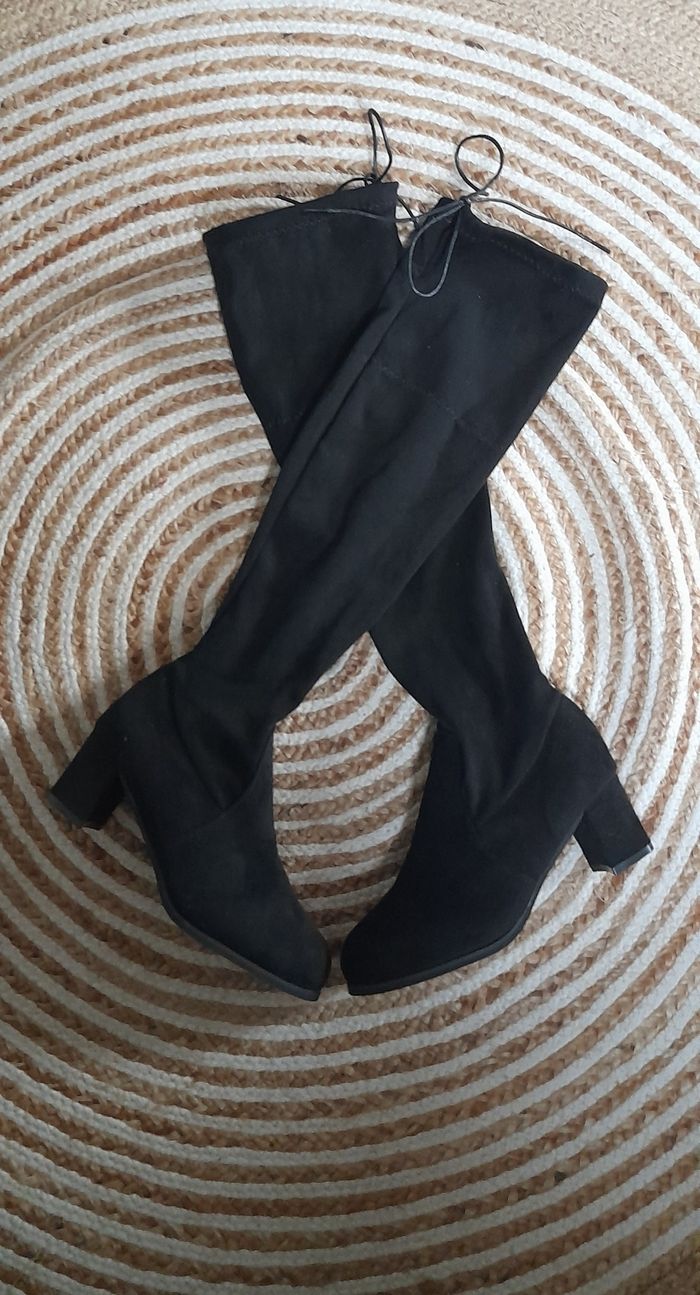 Jolie bottes cuissardes (mi cuisses) en aspect daim. Taille 37. Bout rond Hauteur talon de 5,5cm. Elles sont neuves jamais portées. #CHAUSSURESFEMME38_vanesslavaness #bottes37noir #botteshautes37 #cuissardes37