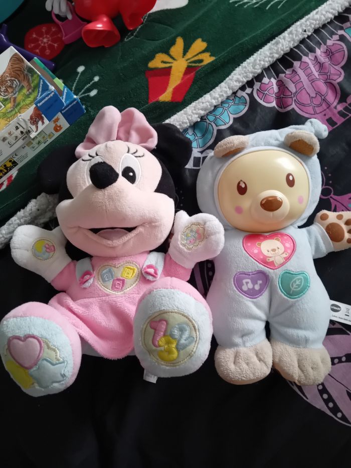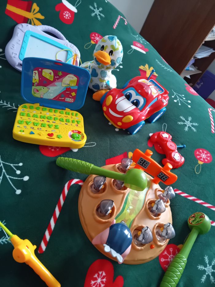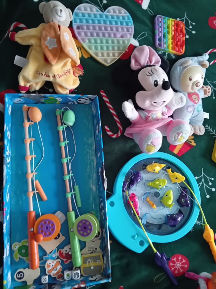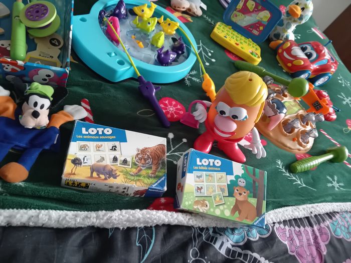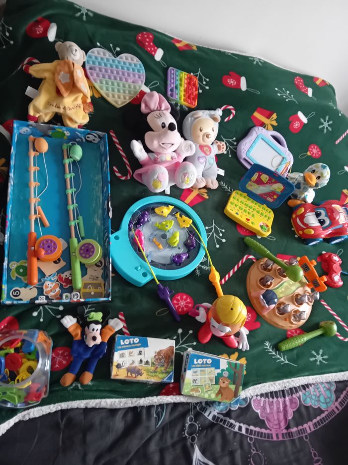 Vend gros lot composé de 2 jeux de pêches ( un avec piles non incluses) 2 jeux de cartes memo dont un incomplet, mini jeux électronique pour apprendre les lettres une voiture télécommandée, Minnie qui chante et Léon mon lumni ourson qui berce pour s'endormir avec bruits de la nature.des lettres magnétiques, peluches.. j'ai beaucoup de livres donc n'hésitez pas à me dire vos préférences pour en avoir un ou 2 en cadeau. 🎁.