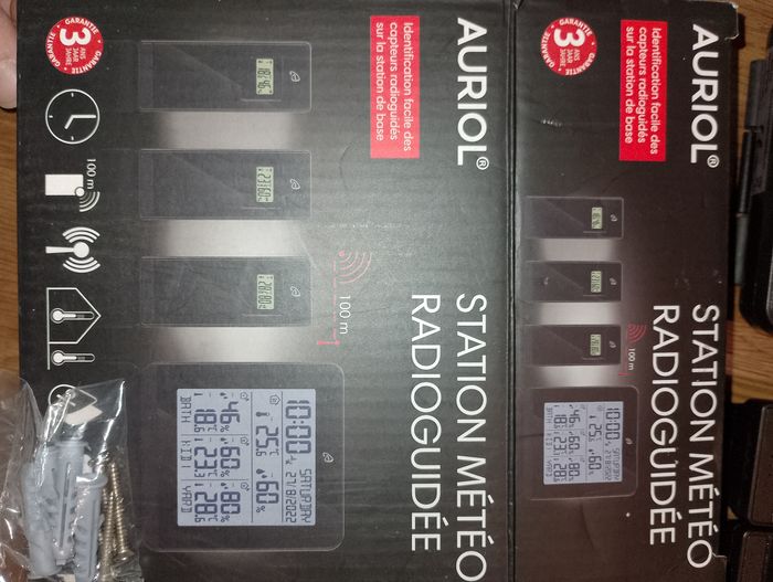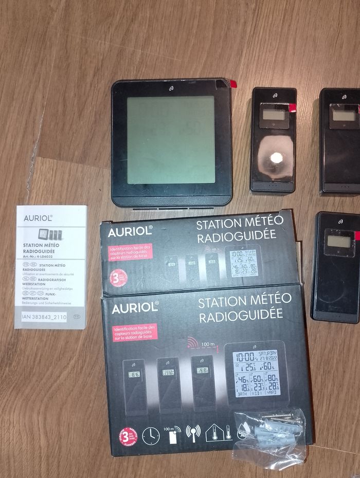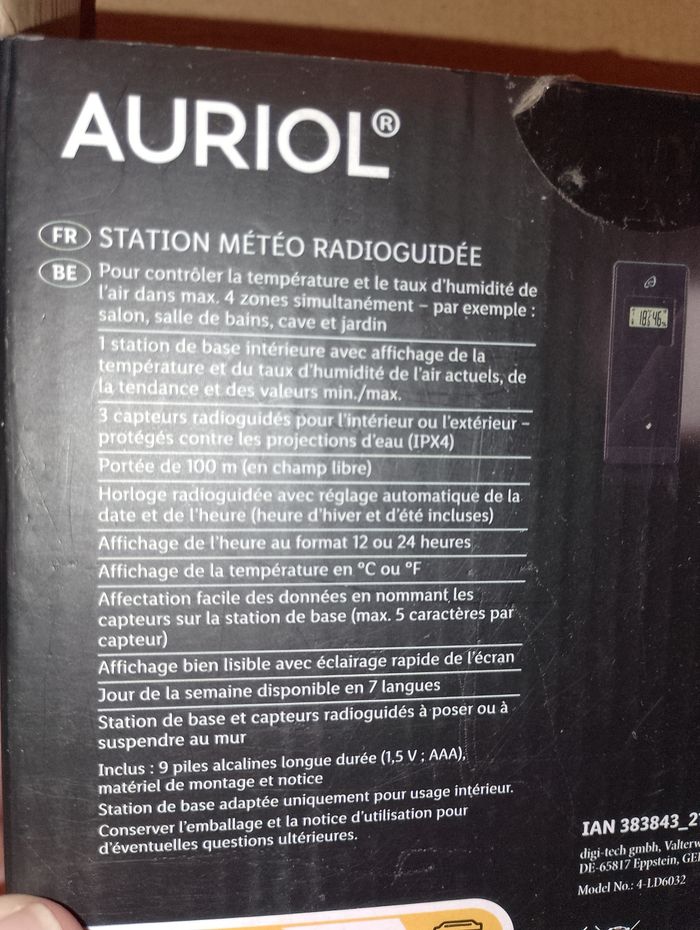 Station météo radio guidée Auriol identification facile des capteurs radioguidés sur la station de base * Pour contrôler la température et le taux d'humidité de l'air dans maximum 4 zones simultanément * 1 station de base intérieur avec affichage de la température et du taux d'humidité de l'air actuel, de la tendance et des valeurs min/max * 3 capteurs radioguidés pour l'intérieur où l'extérieur protégés contre les projections d'eau (IPX4) * Portée de 100m * Horloge radioguidés avec réglage automatique de la date et de l'heure * Affichage de l'heure au format 12 où 24h * Affichage de la température * Affectation facile des données en nommant les capteurs de la station de base * Affichage bien lisible avec éclairage rapide de l'écran * Jour de la semaine disponible en 7 langues * Station de base et capteurs radioguidés à poser où à suspendre au mur * Notice d'utilisation incluse