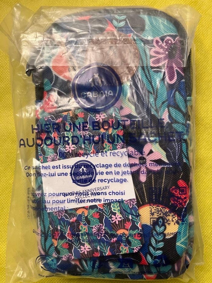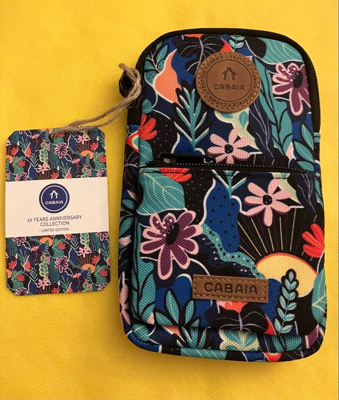 Pochette téléphone Édition spéciale : Pour célébrer 10 ans de créativité Marque Cabaia, modèle Paraty Neuf avec étiquettes Plus pratique (et sécurisé) que votre poche Dimensions : 10cm x 18cm x 2cm Caractéristique : Bande élastique anti-vol Fonctionnalité : Compatible avec nos cordons et bandoulières Garantie à vie Poche secrète zippée à l’arrière Légère et compact Système MOLLE pour attacher les pochettes avant Nano Cordon réglable et interchangeable Vegan et déperlante