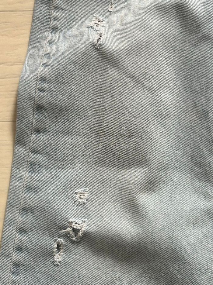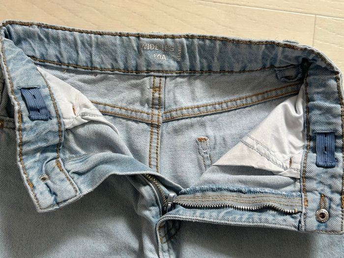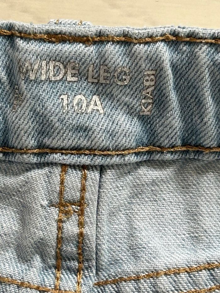 jean large legg fille, en denim clair de la marque « Kiabi ». Taille 10 ans / 140 cm. Effet déchiré devant, mais léger. Élastiques à la taille pour ajuster. En très bon état.