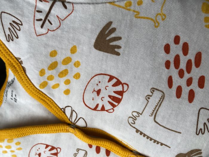 De couleur blanc et jaune, motifs tigres, crocodiles, girafes, feuilles tropicales dans les tons marrons, jaunes, rouges.