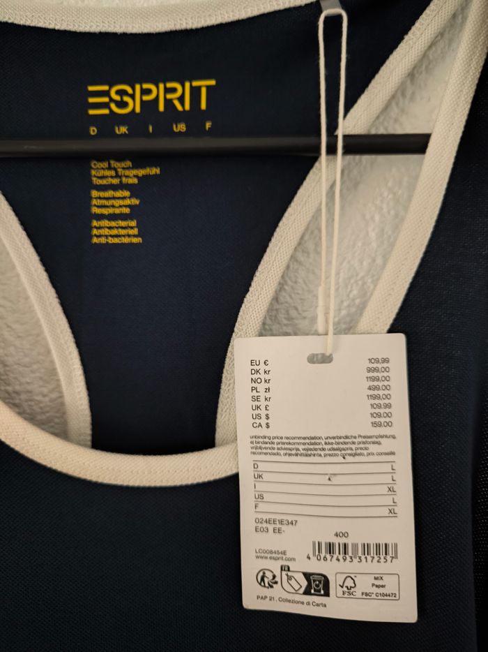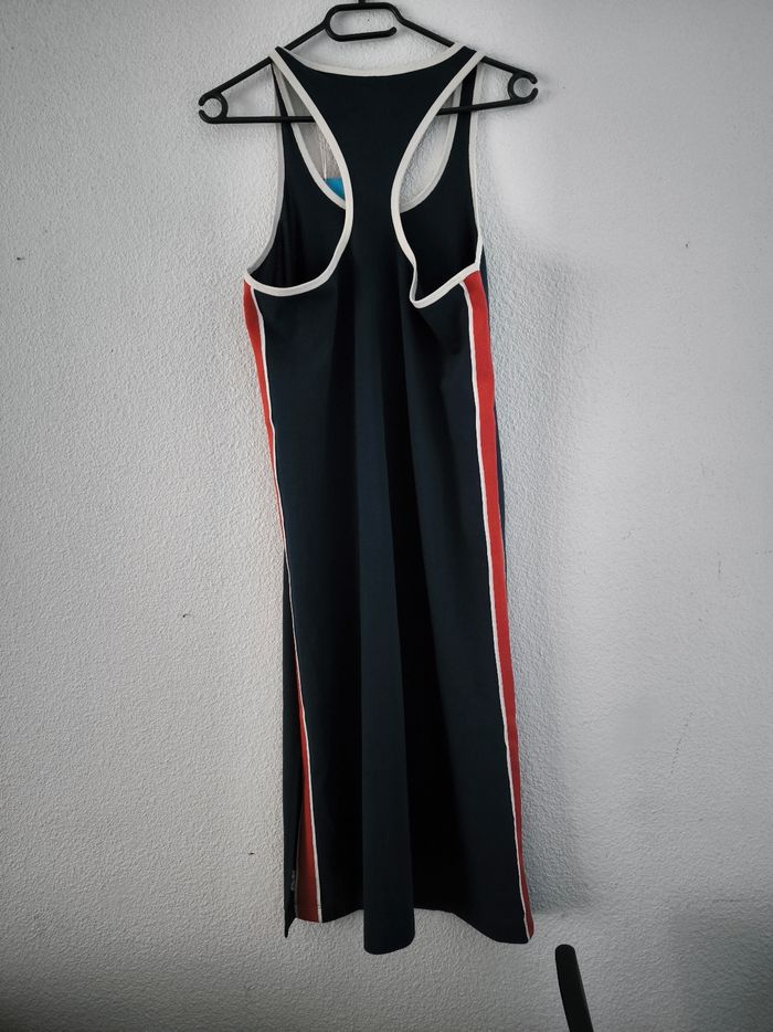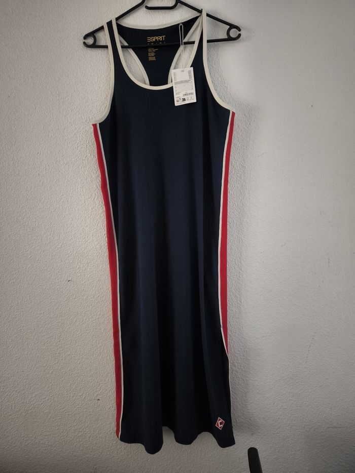 Robe sans manches de la marque Esprit, taille XL (FR), équivalent L US/UK/D. Coloris bleu marine avec bandes latérales rouges et blanches pour un look dynamique et moderne. Coupe racerback au dos, matière respirante, antibactérienne et effet "cool touch", idéale pour l’été ou les activités sportives décontractées. 🔹 État : Neuve avec étiquette 🔹 Matière : Stretch confortable, agréable à porter 🔹 Détails : Logo discret en bas de robe, finitions blanches contrastantes 🔹 Prix boutique : 109 € – vendue bien moins cher ici ! Parfaite pour un look casual, sport ou streetwear. Envoi rapide et soigné 📦 35/1