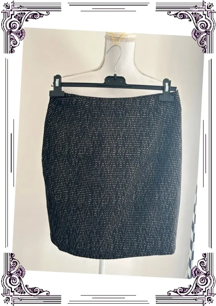 Superbe jupe Elora, taille 34, de couleur noire, avec deux bandes stylées façon clouté à l’avant pour un look moderne et élégant.