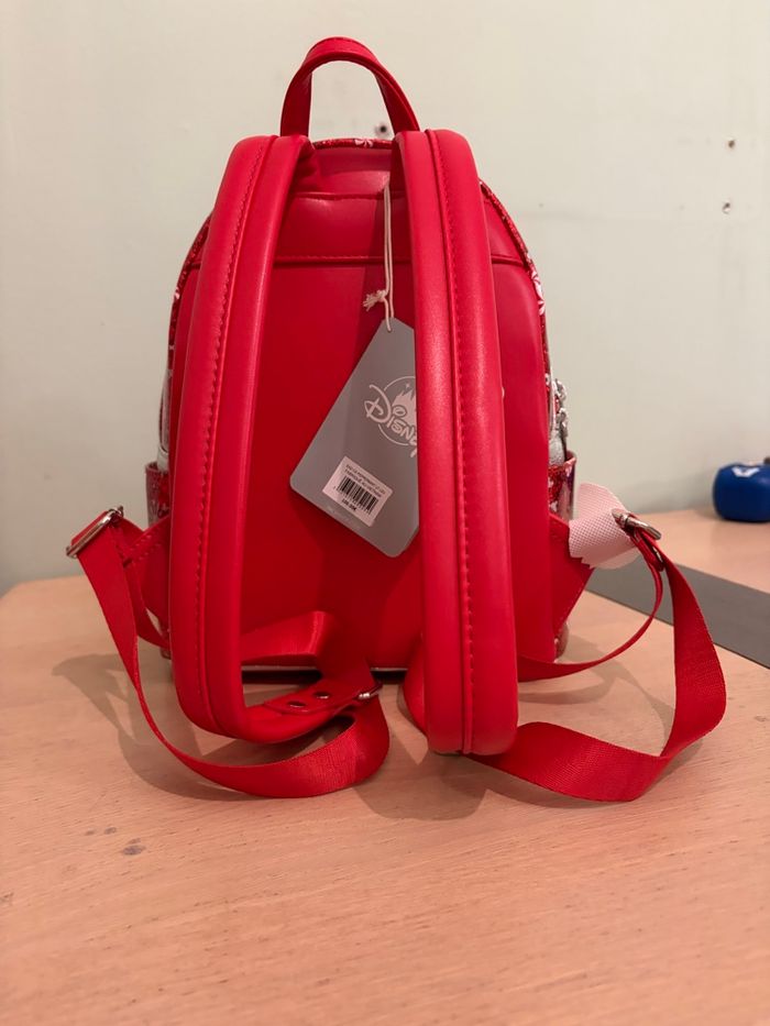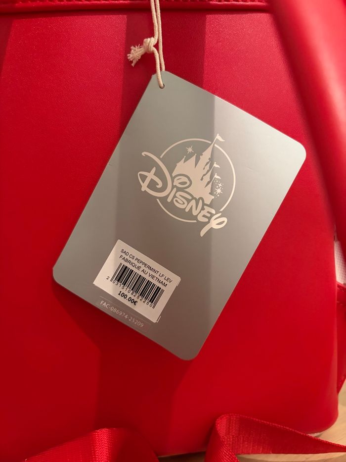 Le sac est orné d’un design pailleté rouge étincelant avec des bonbons en forme de tête de Mickey 🍭
