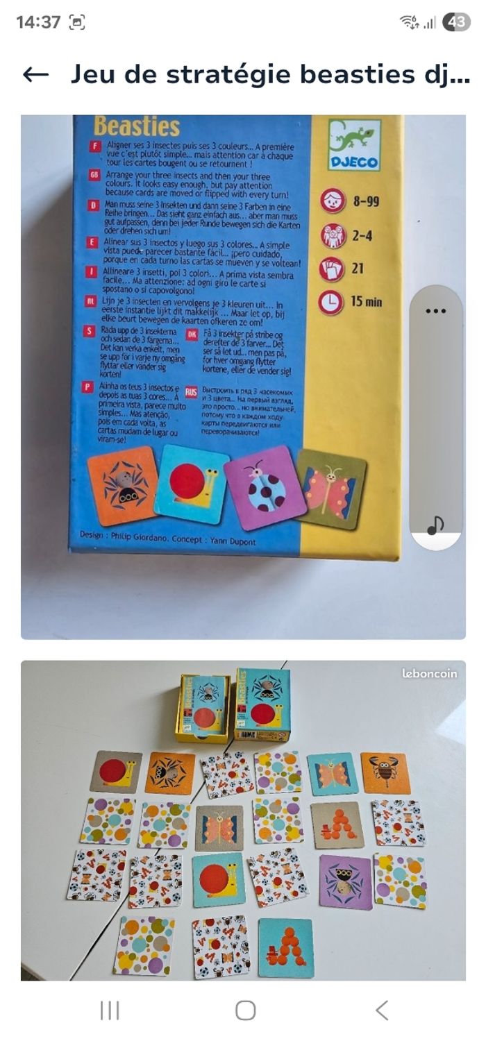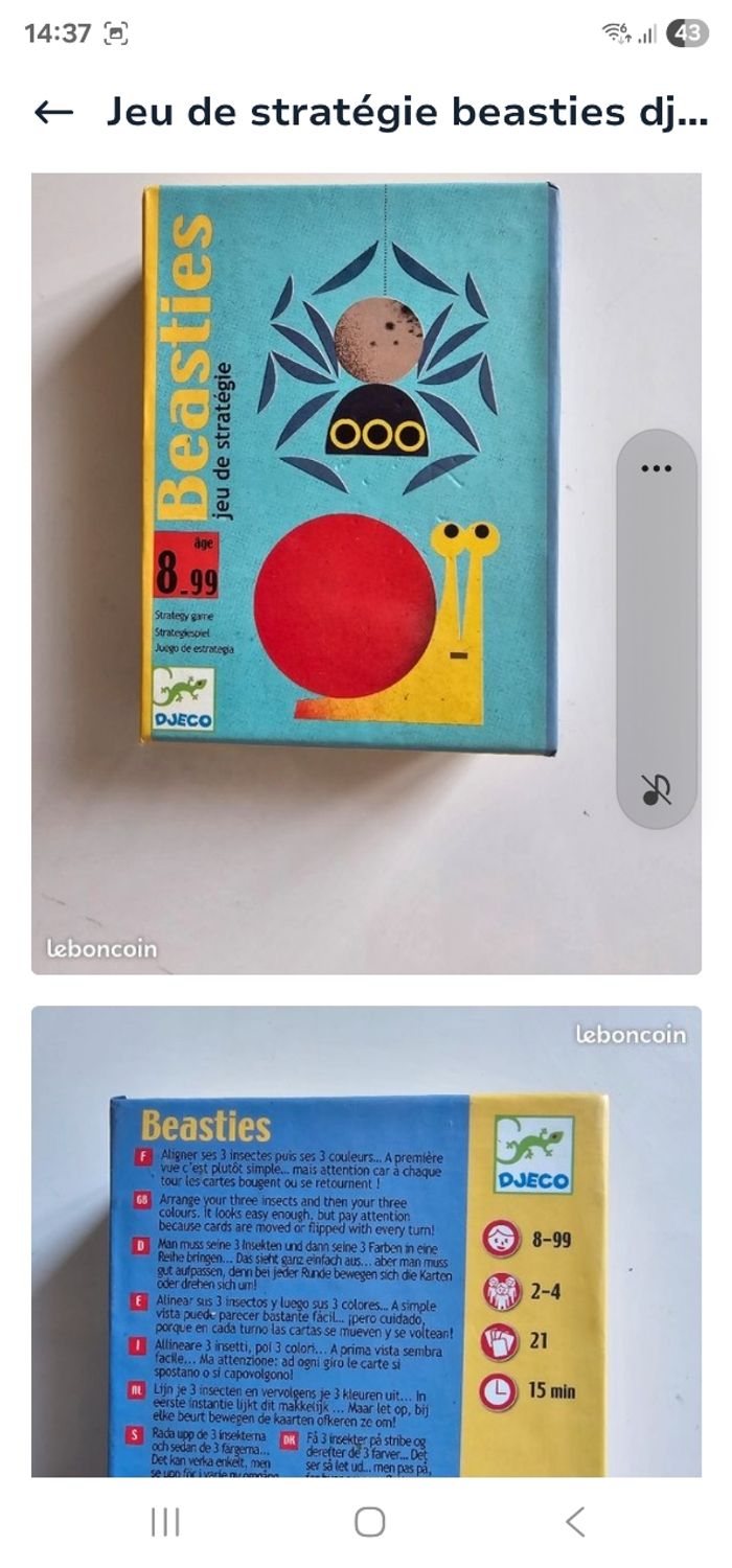 Jeu de stratégies Beasties De 8 à 99 ans Marque DJECO Il n a jamais servi 2 à 4 joueurs 21 cartes avec notice Durée 15 min