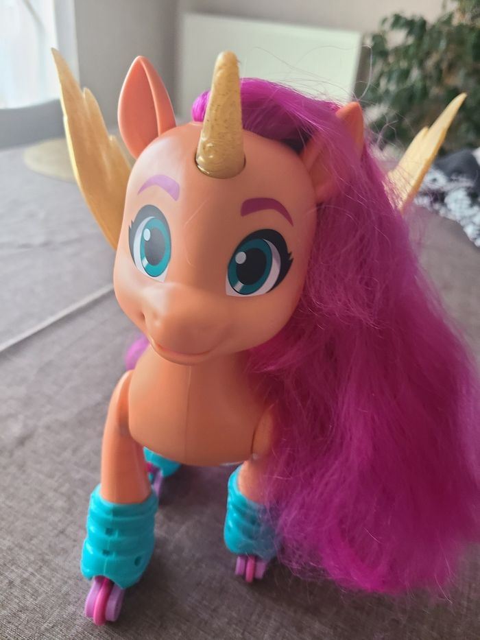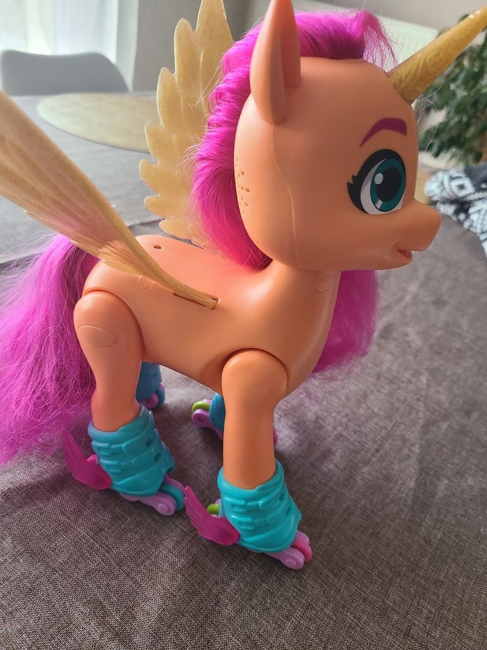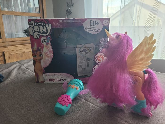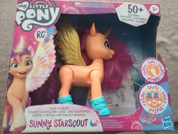 My little pony en très bon état PLUS DE 50 COMBINAISONS : Le poney interactif émet plus de 50 combinaisons de sons, lumières et mouvements, pour que les enfants imaginent des aventures et des histoires avec leur personnage préféré du film STYLES D'ALICORNE PERSONNALISABLE : On décore la figurine avec les autocollants inclus pour un look unique. La figurine a une crinière rose, sa corne s'illumine et ses ailes bougent, comme dans le film JOUET INTERACTIF POUR ENFANTS : On dansera sur la musique ou on jouera à « Ne bouge plus Sunny » avec le micro. Ce pack My Little Pony est un super cadeau pour filles et garçons, dès 5 ans