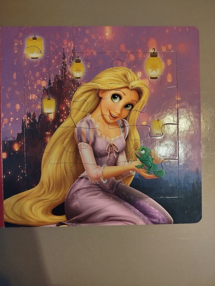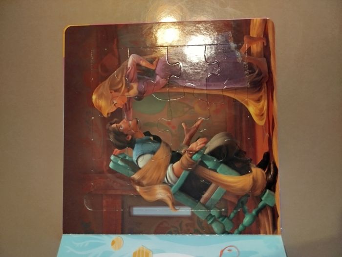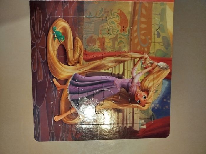 Livre puzzle raiponce. 5 puzzles au total en très bon état Un petit accroc sur le haut du livre (voir photo) qui n'empêche pas son utilisation.