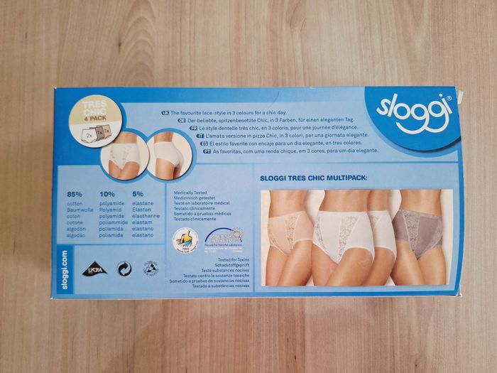 Lot de 4 culottes maxi marque Sloggi taille 46 neuves jamais porté. Matière : 85% coton, 10% polyamide, 5% élasthanne.