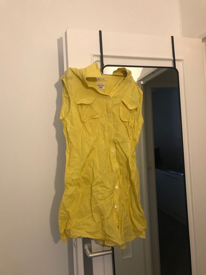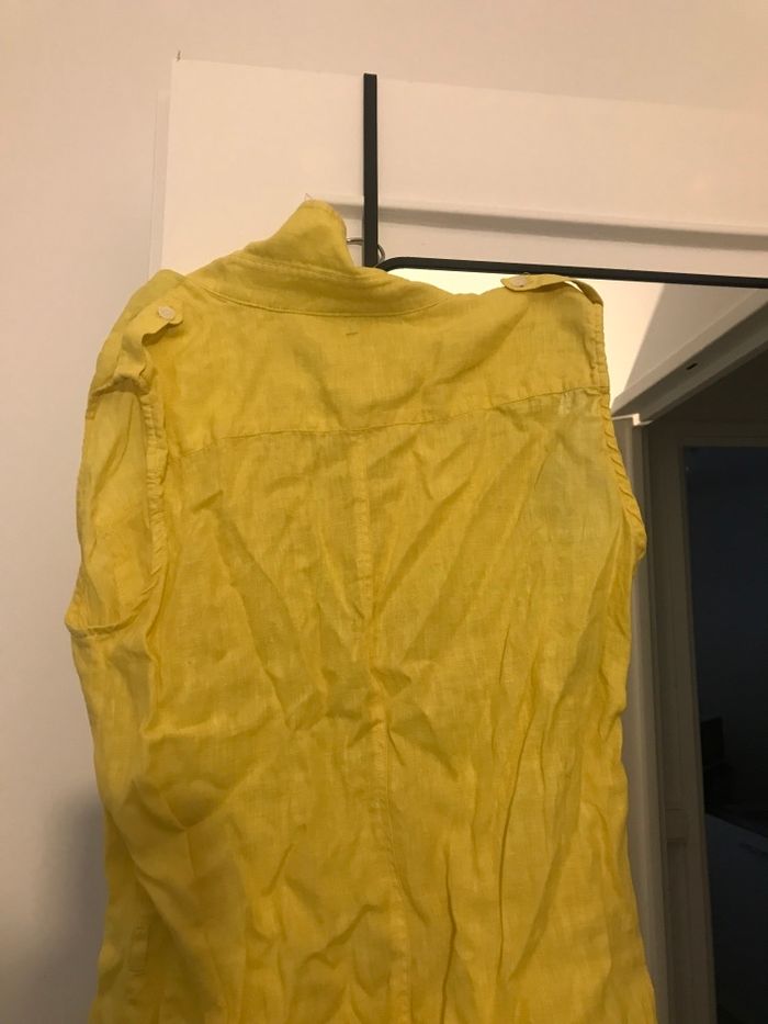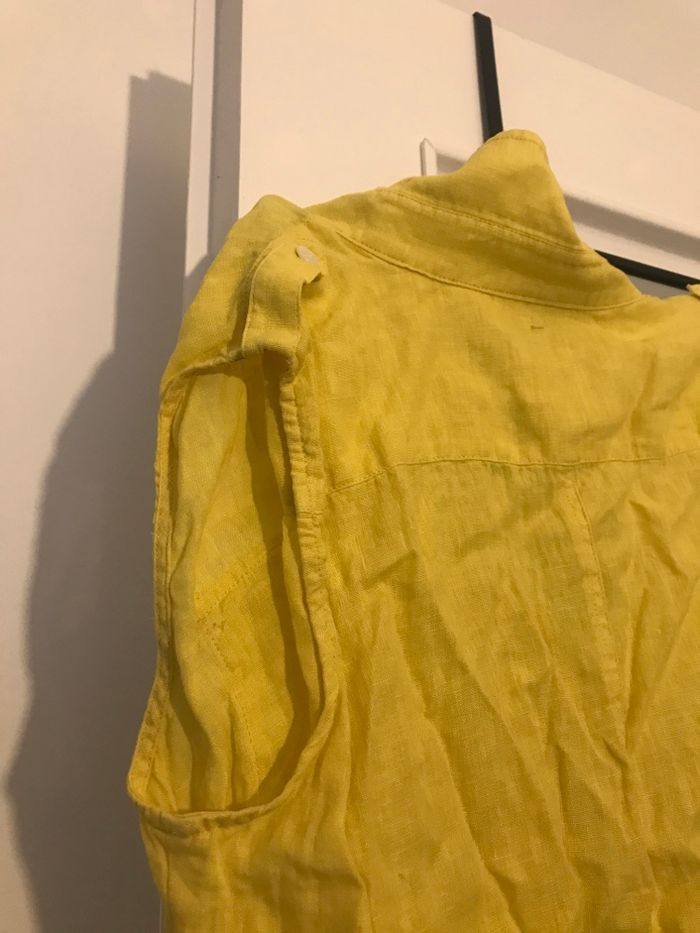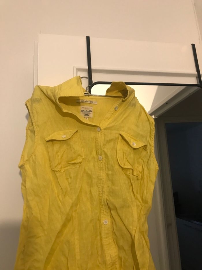 Chemise pour femme taille 40 couleur jaune matière en coton tee-shirts pantalon veste gilet chaussure il manque un bouton