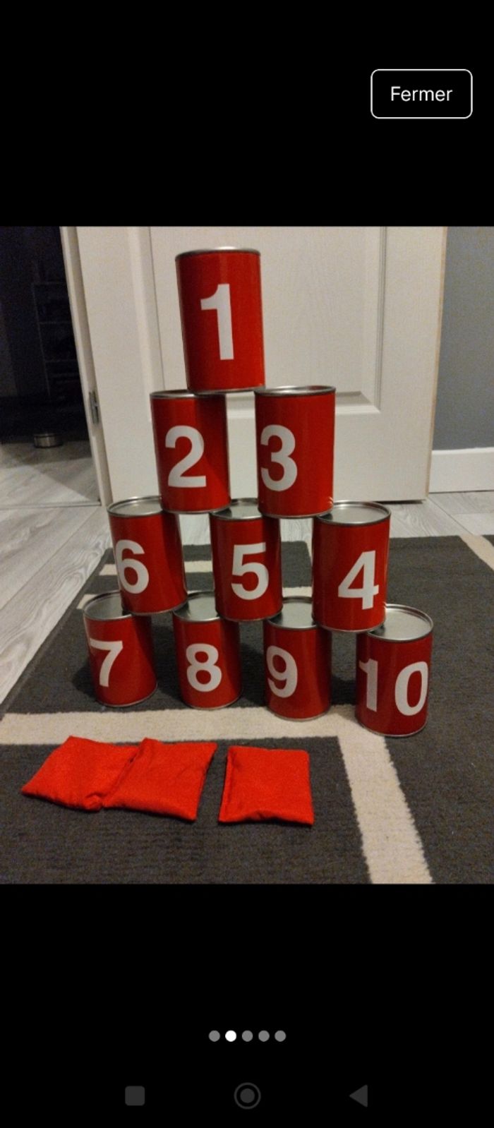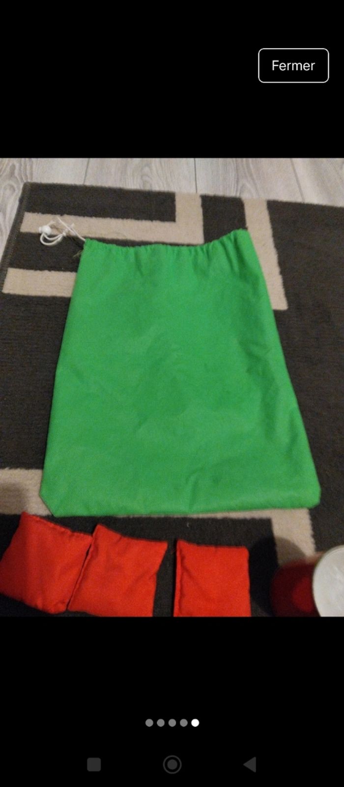 Jeu chamboule tout en bon état quelques traces suite a l'utilisation mais reste correct. Vendu avec son sac de rangement.