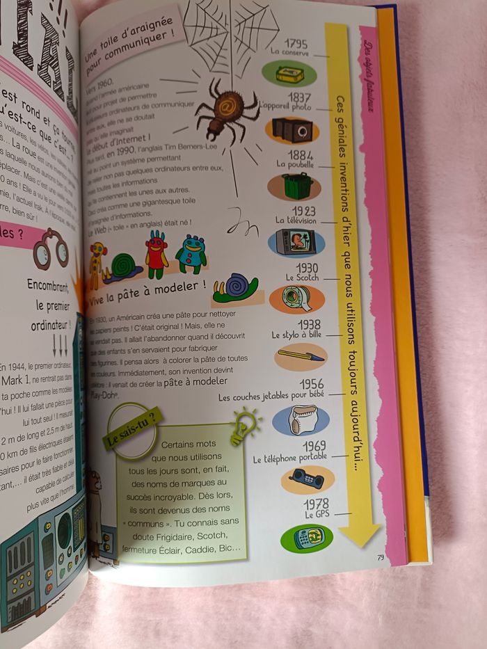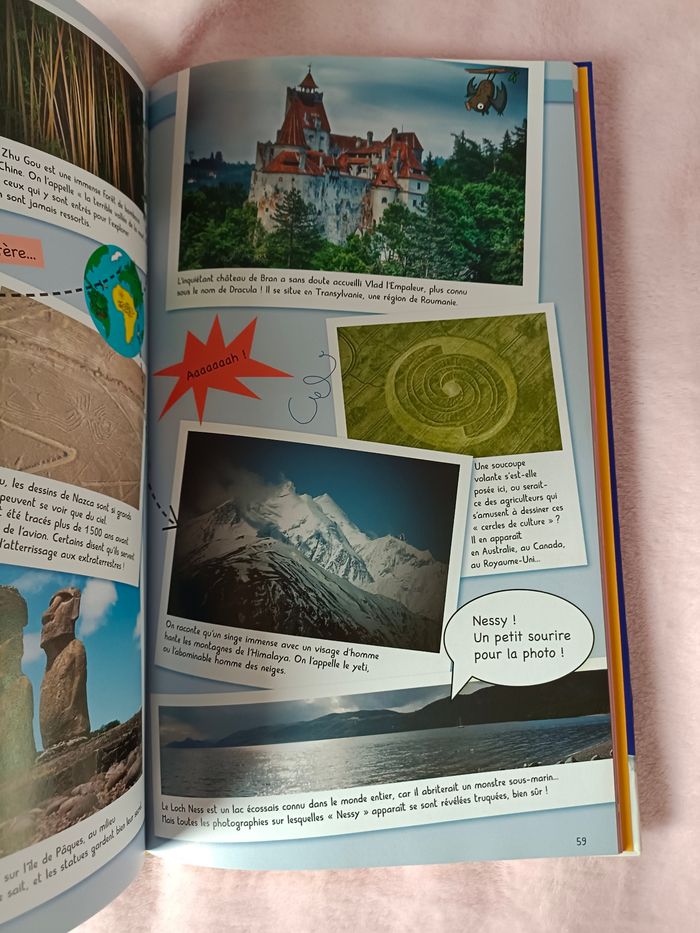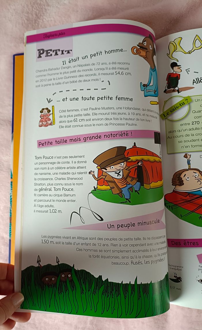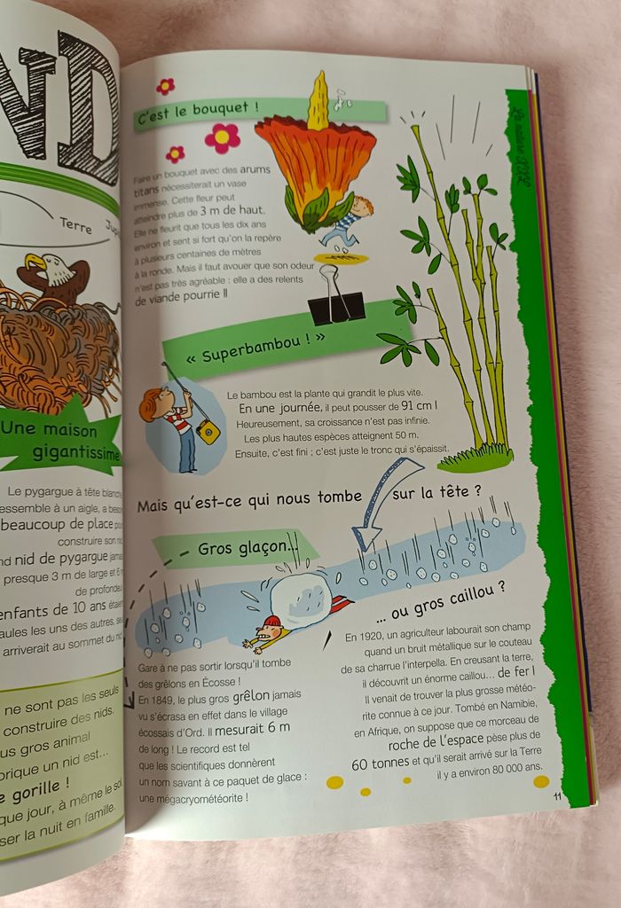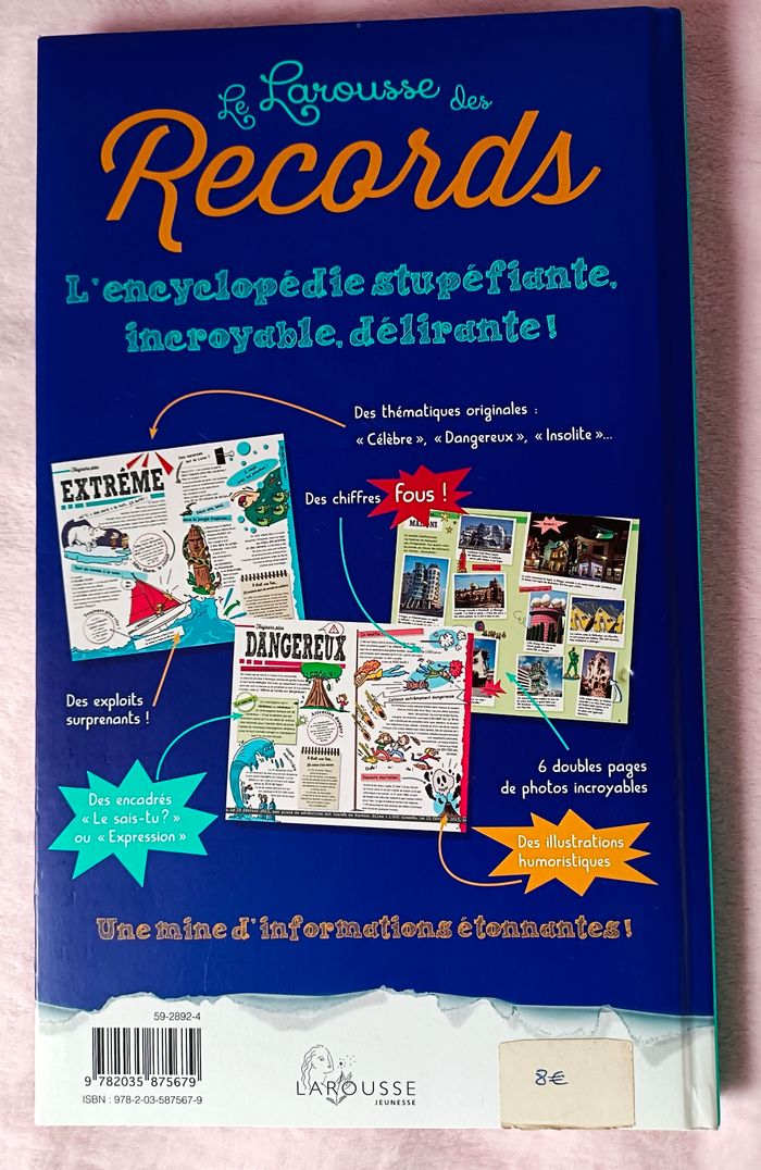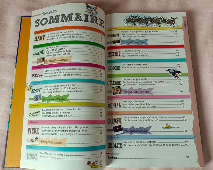 14 entrées thématiques, divisées visuellement en 14 couleurs, introduites par des qualificatifs : toujours plus haut, toujours plus petit, toujours plus rapide… Ces entrées sont elles-mêmes divisées, sur 2 ou 3 doubles-pages, en sous parties qui présentent chiffres ou faits étonnants, voire extrêmes, réalisés par les hommes (pages inventions, premières scientifiques…) mais aussi par les animaux ou par la nature elle-même. Sommaire : Toujours plus… haut ; grand ; petit ; rapide ; long ; vieux ; extrême ; nombreux ; dangereux ; profond ; célèbre ; génial ; courageux ; insolite. - Pour chaque page, des têtières, des textes courants, des encadrés, des éclatés, des « le sais-tu ? » ou encore « il était une fois », qui rapportent de l’information incroyable (mais toujours vraie) de façon drôle et anecdotique ou de manière plus sérieuse. Le mélange « accroche » - paragraphe, ainsi que la maquette, avec ses niveaux de lecture différents, créent la richesse et l’identité de l’ouvrage. - L’alternance d’images détourées, réalistes ou décalées, voire humoristiques, renforcent cette spécificité. -En récréation, 5 double-pages distillées dans la pagination, proposent aux enfants des quiz sur différents sujets « records ». Une encyclopédie pour les 8/12 ans qui veulent tout savoir sur les exploits les plus dingues #livreenfantcamilled974
