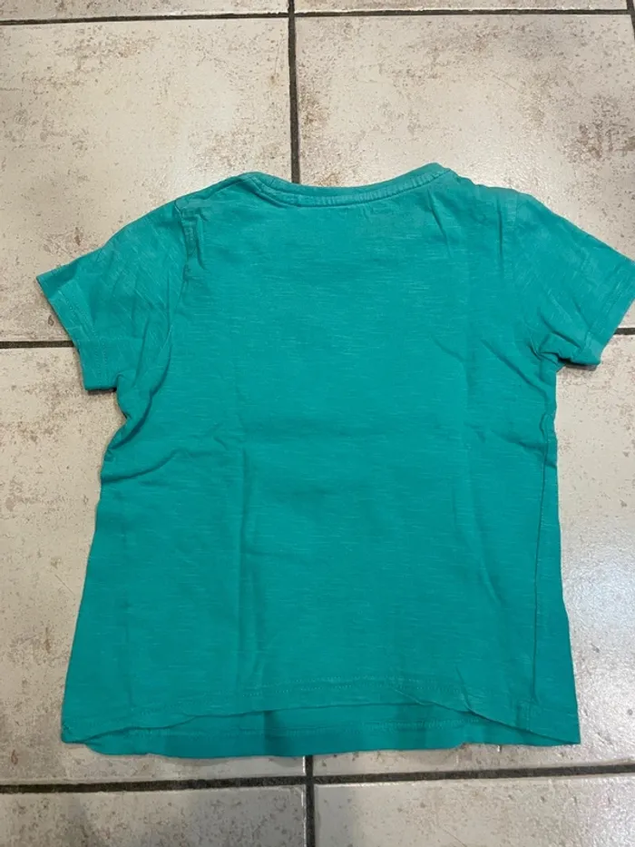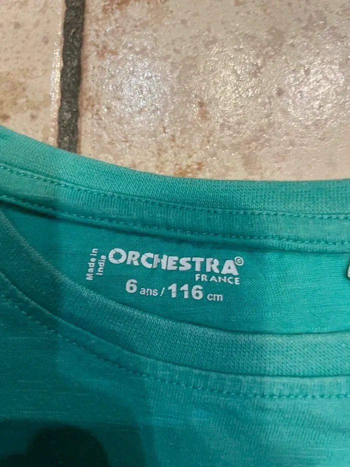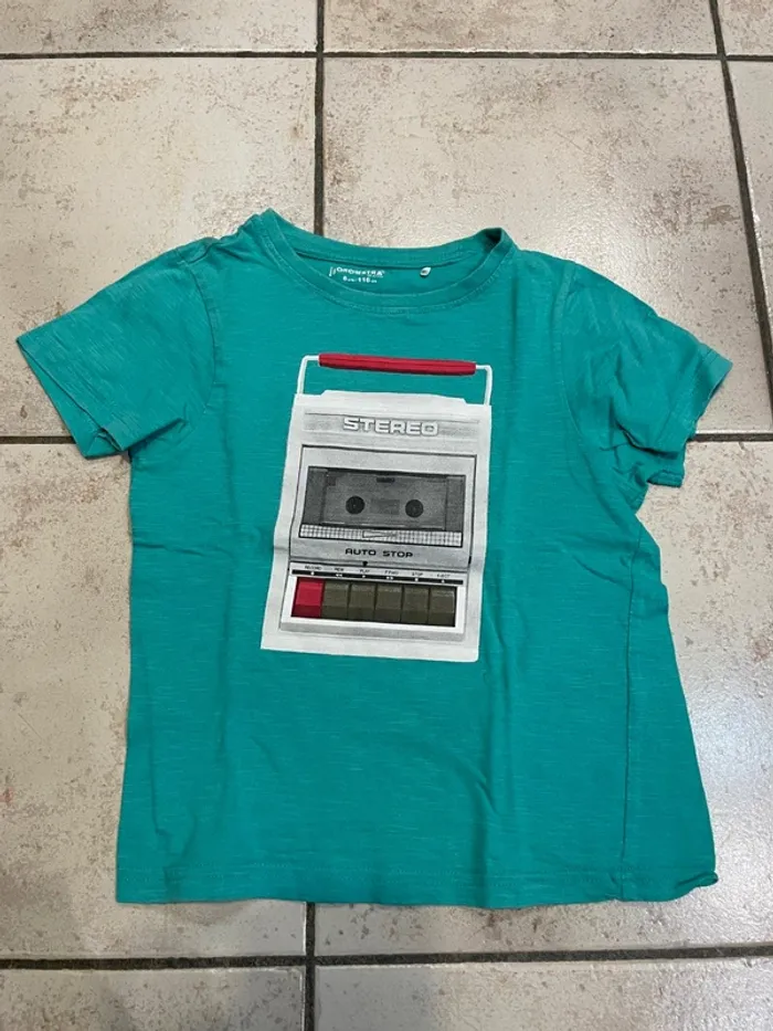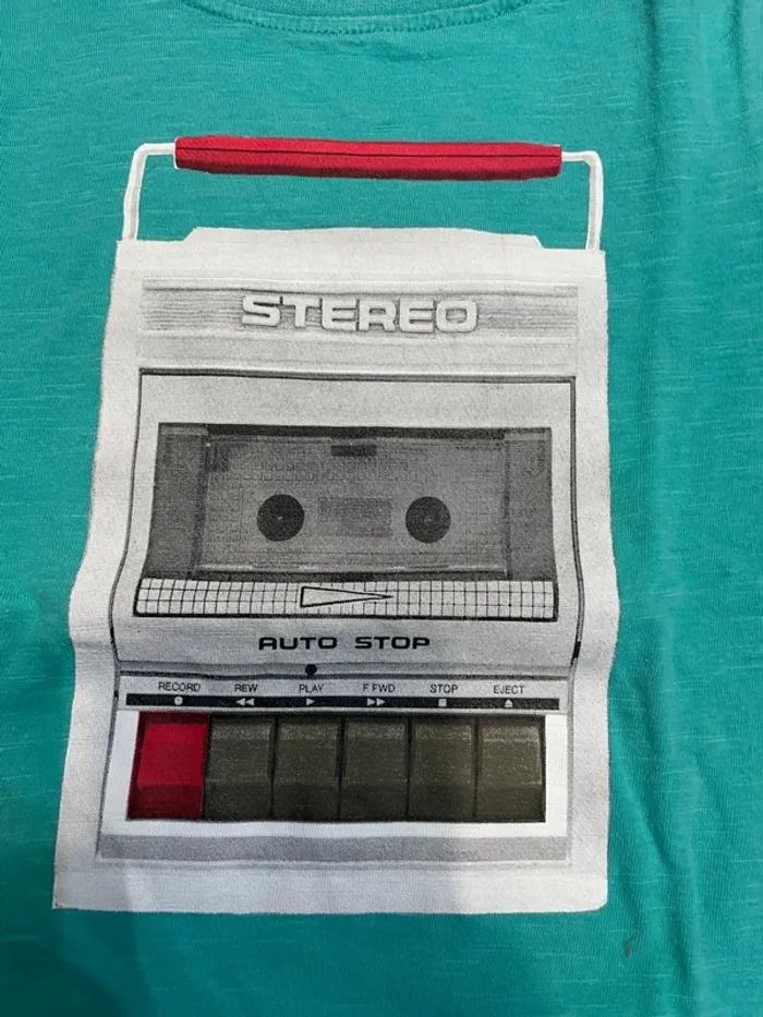 Tee-shirt à manches courtes de marque Orchestra Taille 6 ans Vert clair (ou bleu turquoise?) motif magnétophone à cassette Peu porté, bon état.
