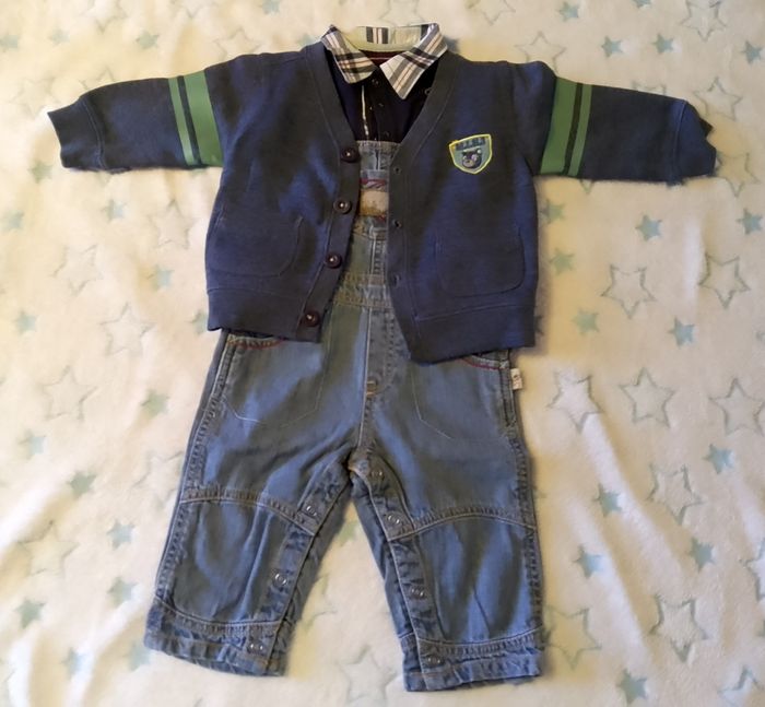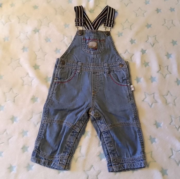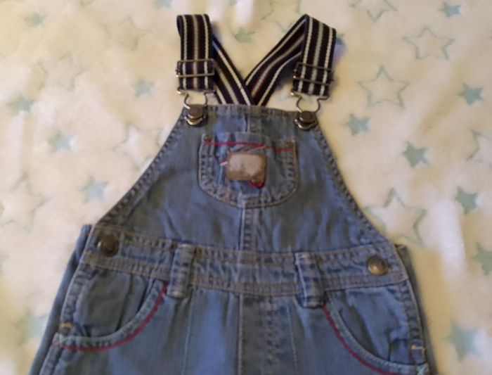 Salopette en jean Sergent Major – pressions à l’entrejambe, portée mais en très bon état dessin devant usé ( le petit carré sur la pochette avant).