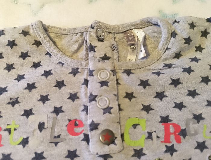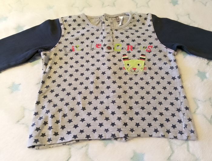 👕 Tee-shirt manches longues motif chat et étoiles, pratique avec boutons d’épaule.