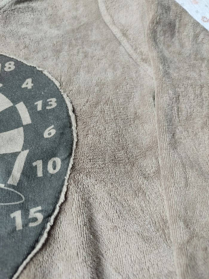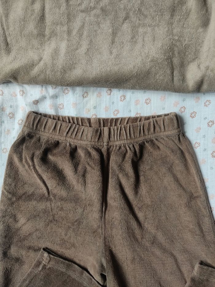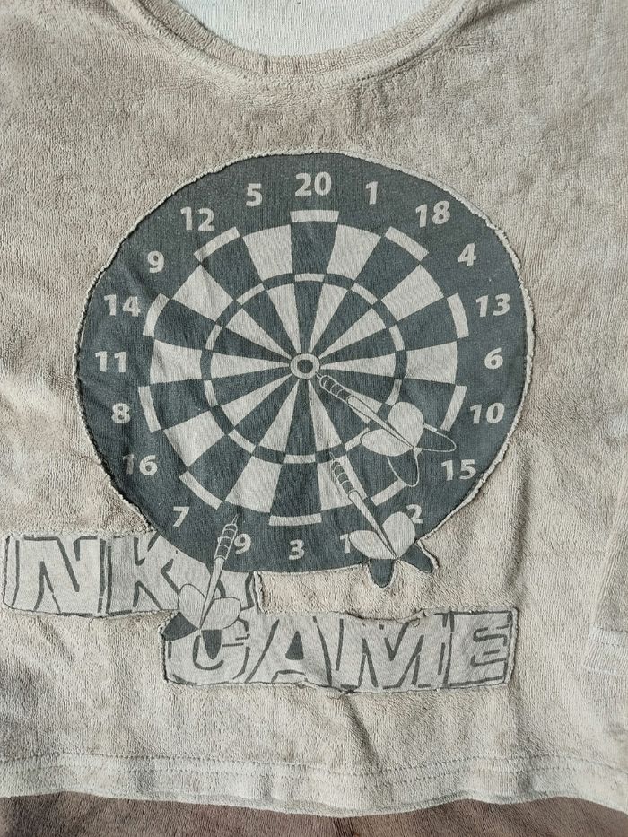 Le haut, dans des tons marron clair, est décoré d’un imprimé cible de fléchette original 🎯. Le pantalon, marron plus foncé, complète parfaitement l’ensemble.