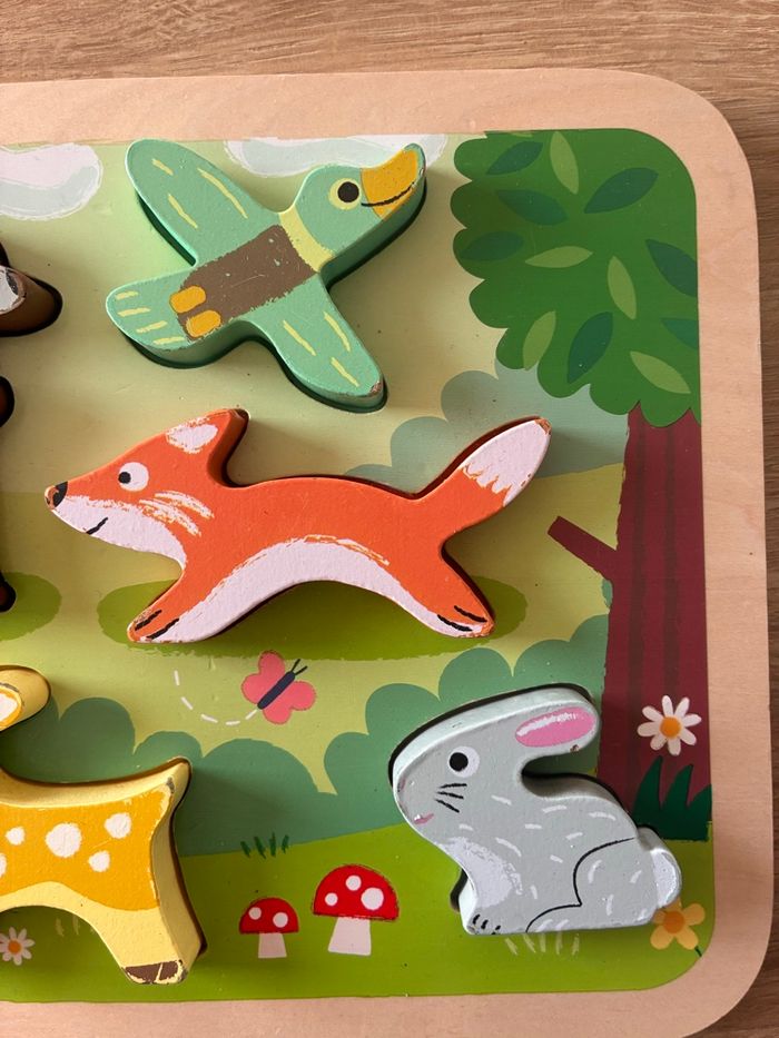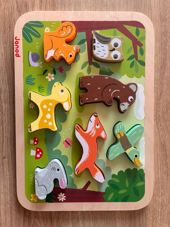 FOREST ANIMALS: With this wooden puzzle, your child will be amazed by discovering the animals of the forest. Its 7 built-in pieces and pretty illustrations will delight toddlers. Fox, rabbit, squirrel, owl, brown bear, fawn and duck are waiting for him!