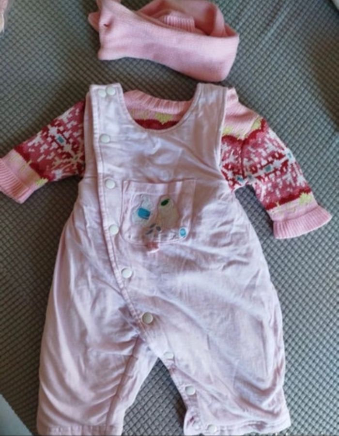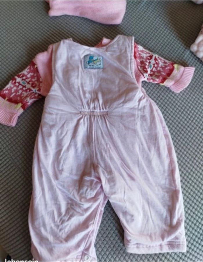 1 ensemble, salopette chaude 1 mois fermeture pressions + pull motif rose rouge ,ouverture arrière bouton + 1echarpe