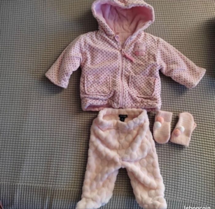 1 ensemble manteau capuche molletonné + pantalon rose mohair 1 mois état comme neuf