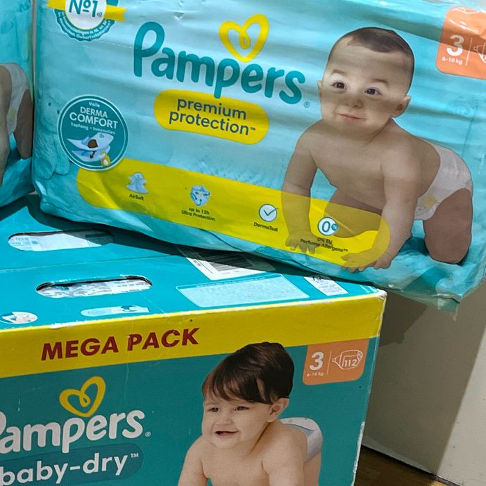 Couches Pampers taille 3 1 carton de 112couches et 2 paquets de 46 couches soit 204 couches au total