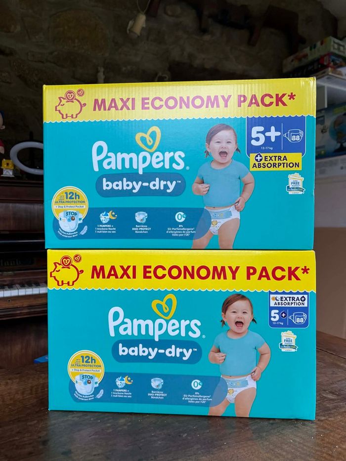 Code -15€ : RENNE30 Jusqu’au : 07/12/25 Lot : 2 cartons neufs. Variété : Pampers baby dry en COUCHE. Taille 5+ : Bébé 12-17 kg Quantité : 176 COUCHES (2*88) #couche #pampers #couchepampers #coucheharmonie #harmonie #premiumprotection #babydry #couchetaille5+