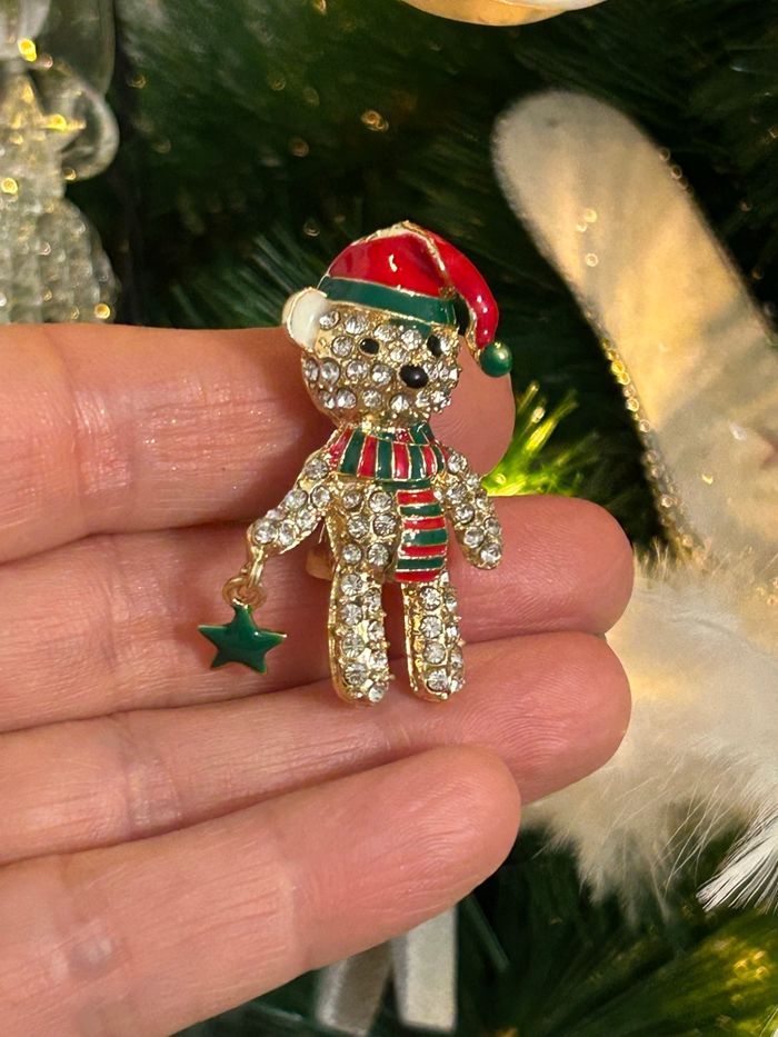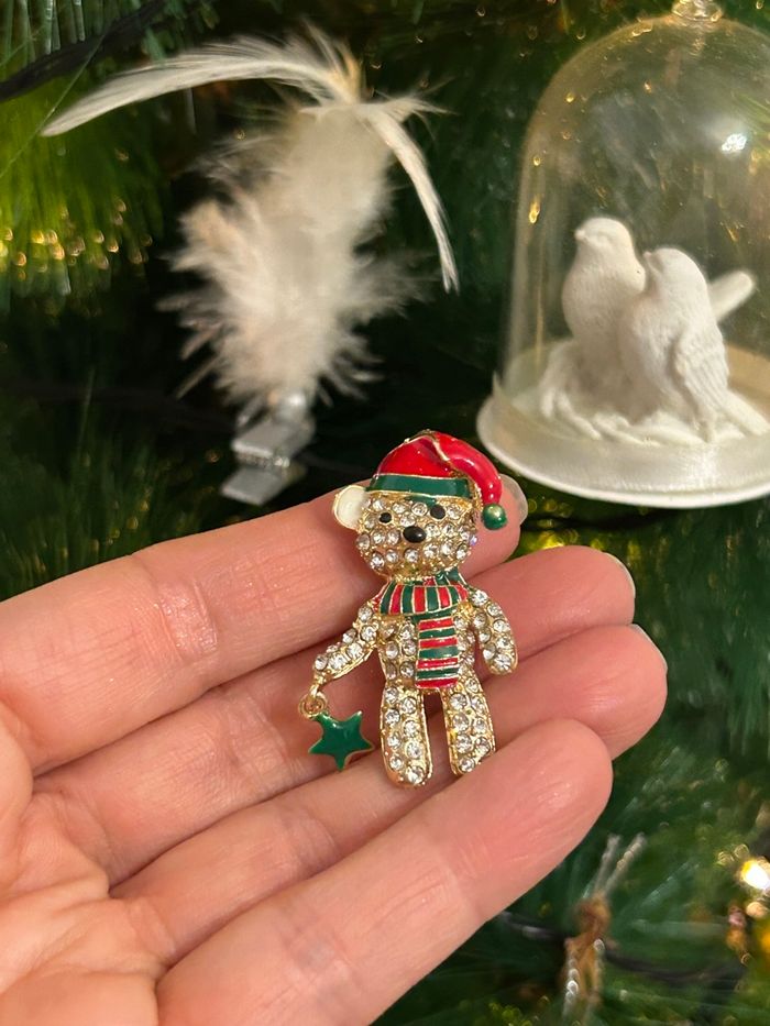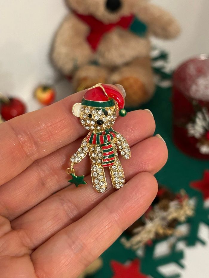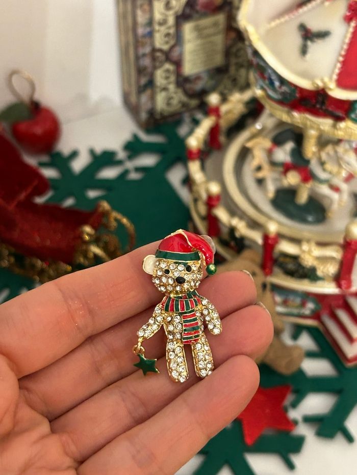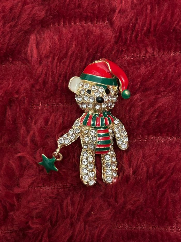 Je vends cette ravissante broche ourson de Noël ornée de petits cristaux très scintillants, un adorable petit ourson avec bonnet de Noël tenant une petite étoile verte amovible