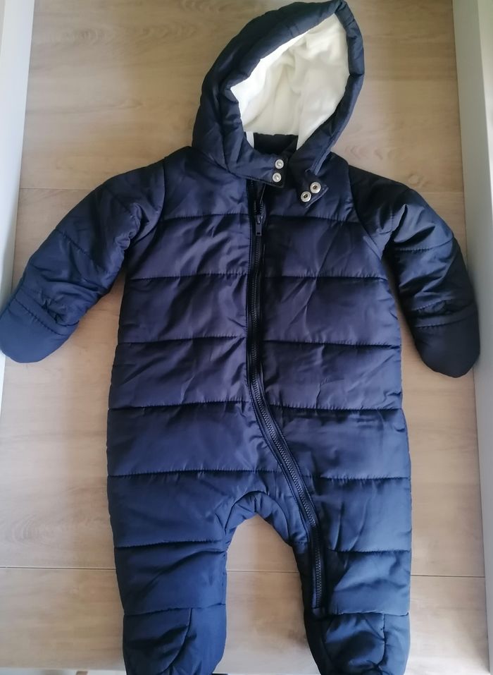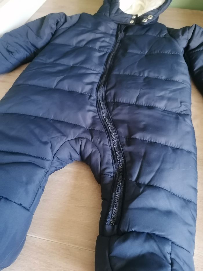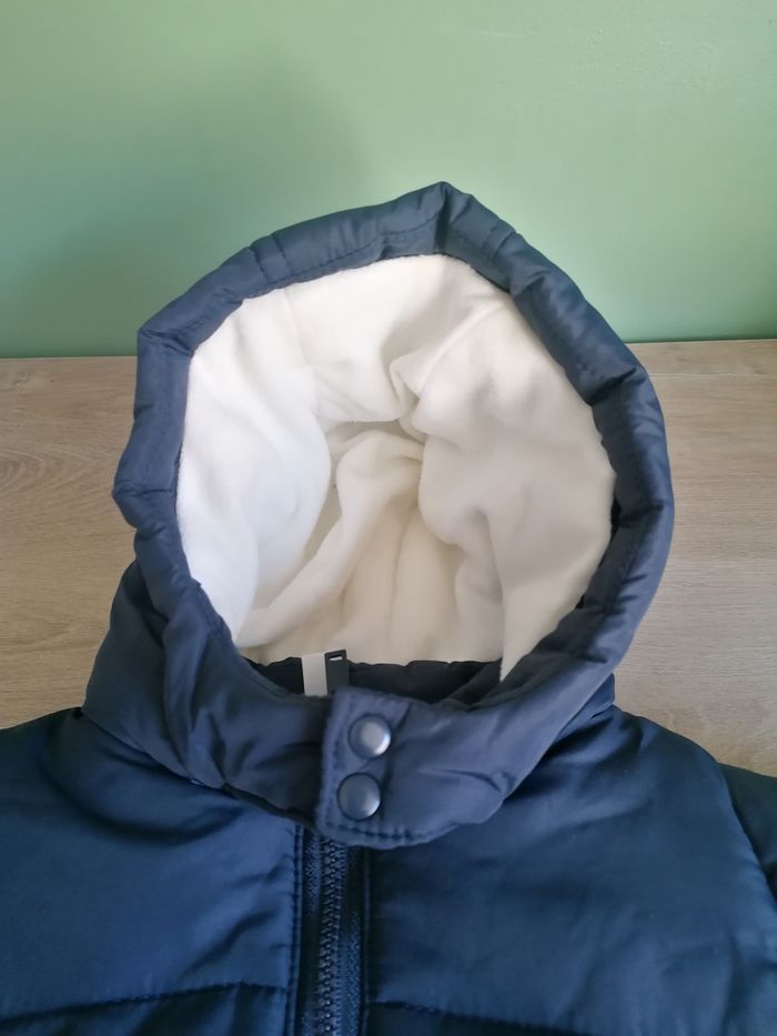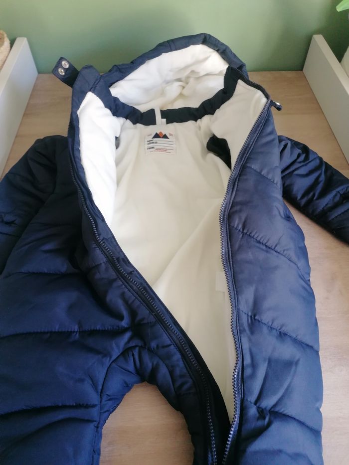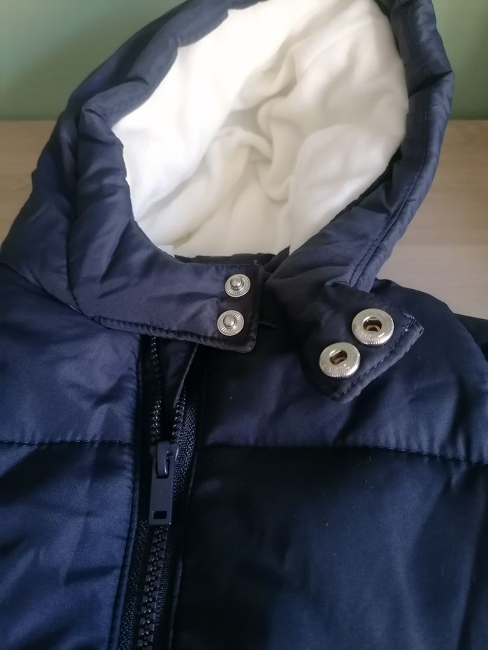 Grande fermeture éclair en diagonale sur le devant et pressions pour fermer la capuche.