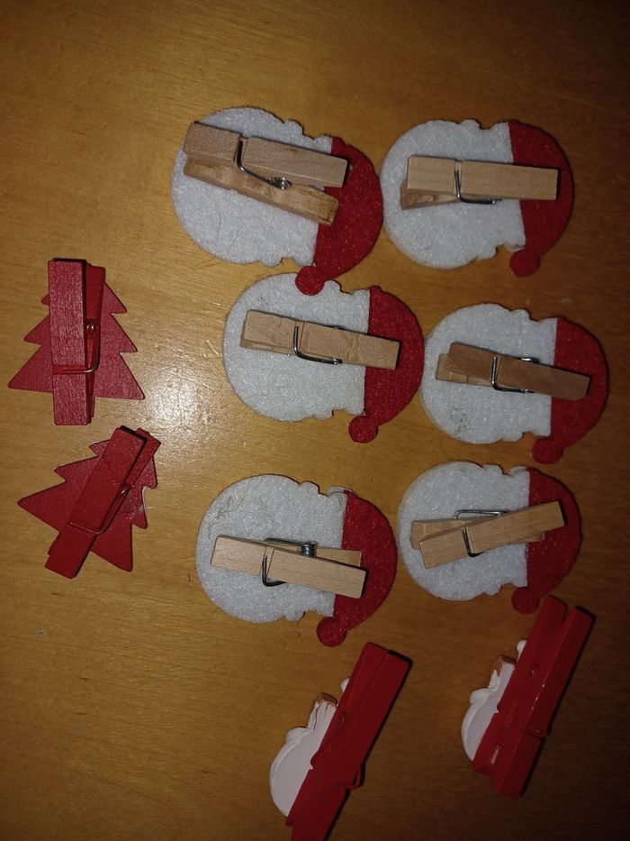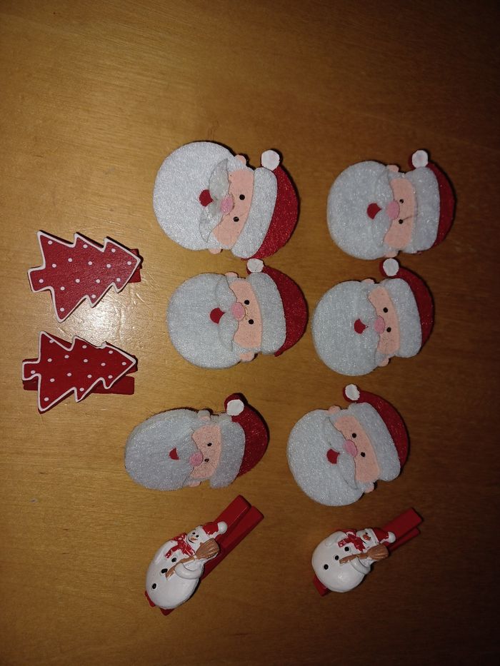 Lot de 10 pinces à linge thème Noël 🎅 6 pères Noël 🎅 2 pinces bonhommes de neige ☃️ et 2 pinces sapins rouge et blanc État neuf.