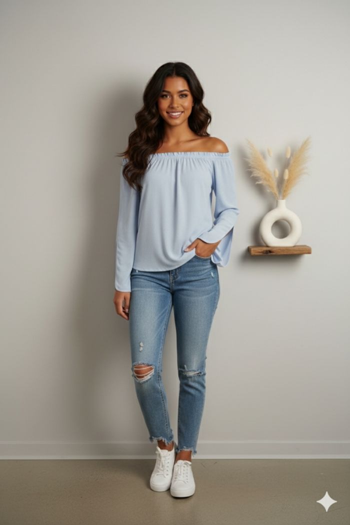 Ce joli haut au épaules dénudées et ses manches originales à fentes ouvertes est prêt à faire des envieuses