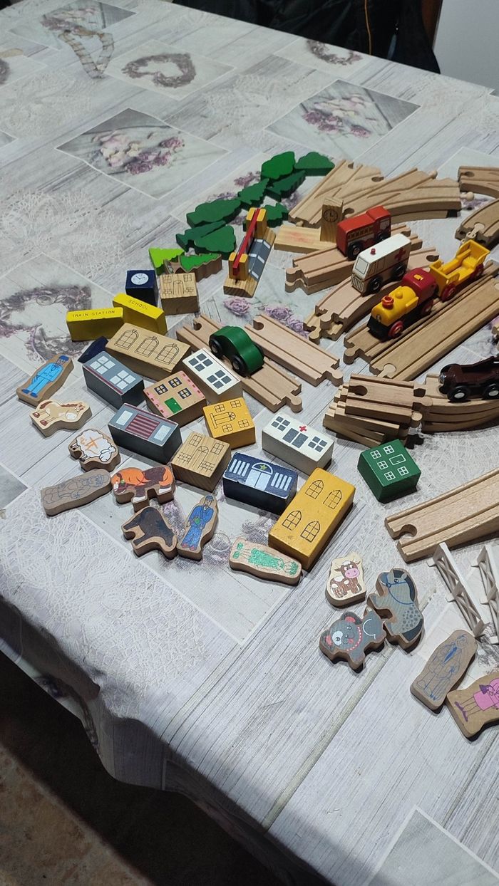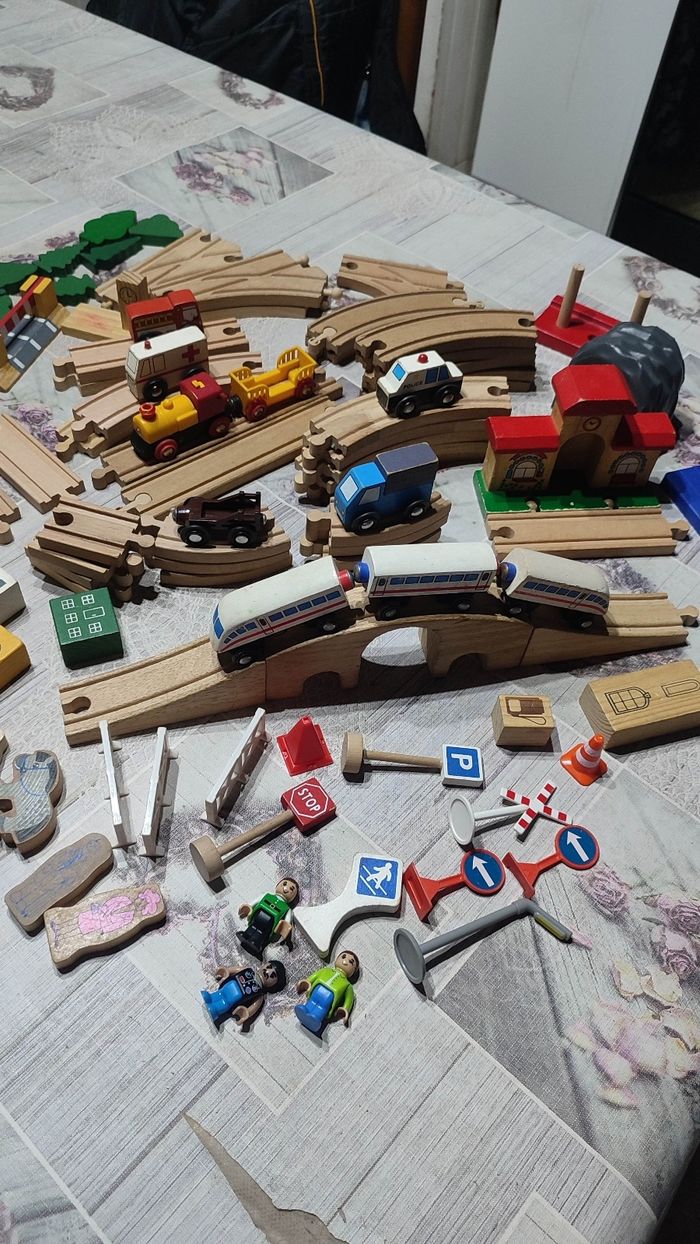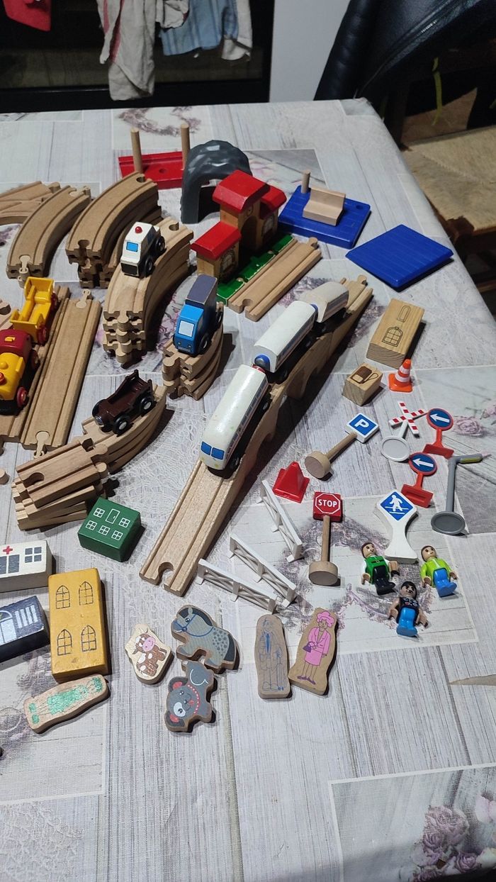 Gros lot de circuits en bois avec énormément d accessoires , véhicules,trains et personnages etc... Bonne état. Prix 25€.