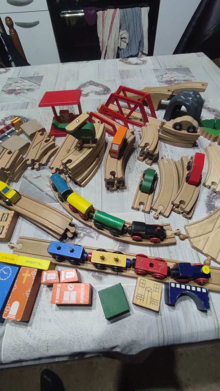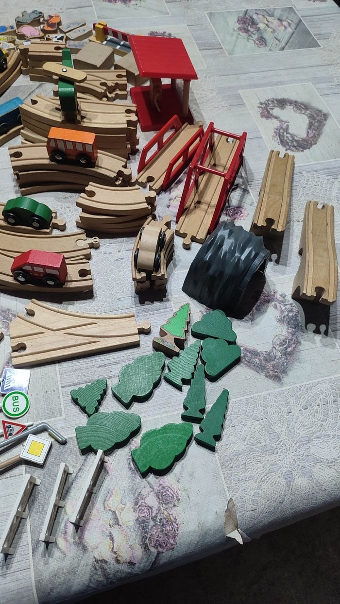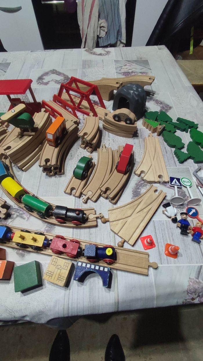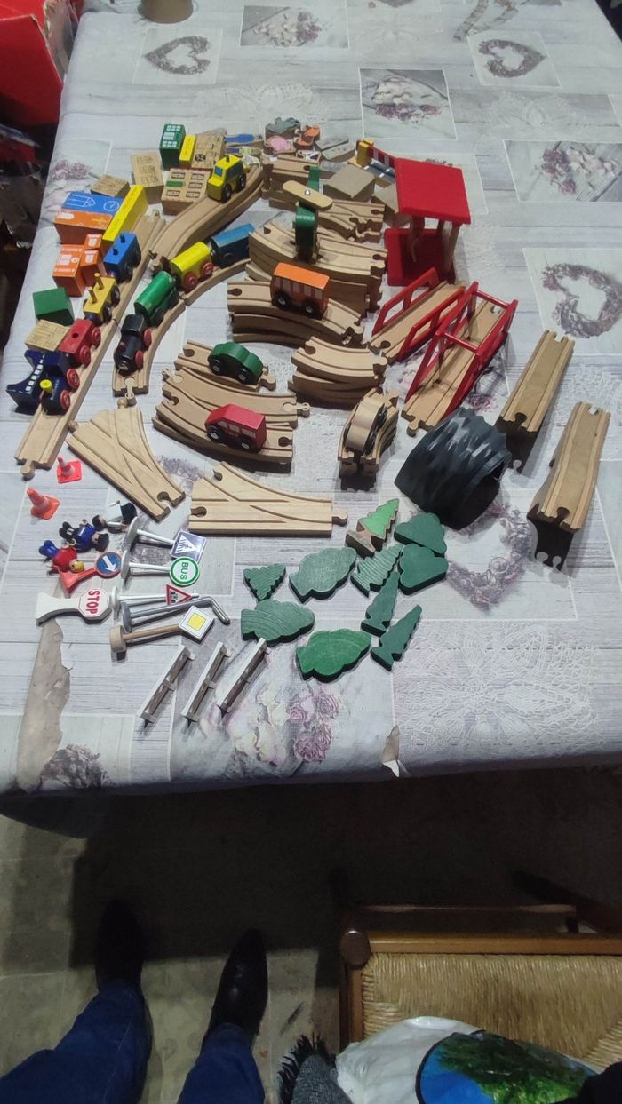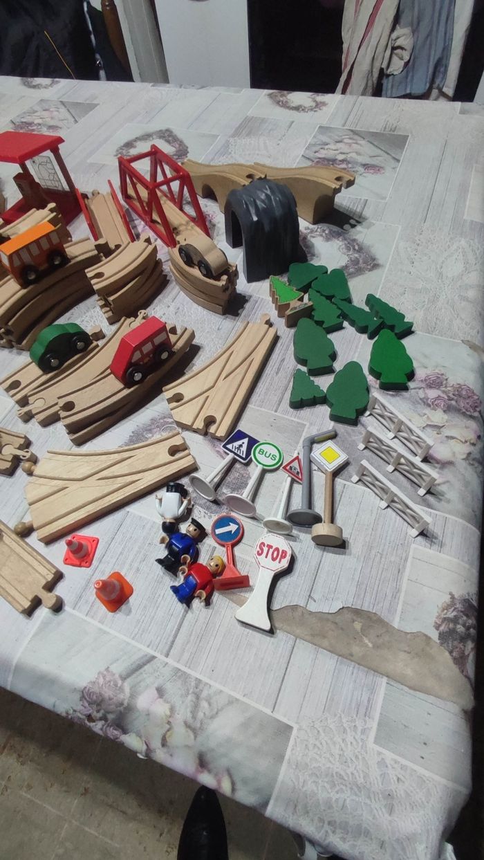 Gros lot N2 de circuits bois avec accessoires ,trains, véhicules,personnages etc... Bon état. Prix 25€.