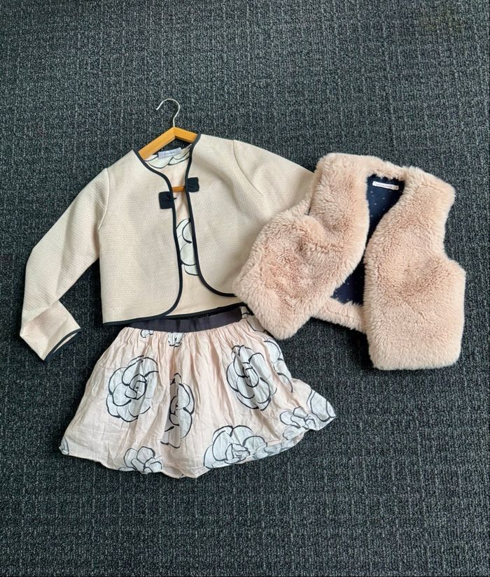 🎄✨ Ensemble Marèse – 6 ans – Neuf jamais porté ✨🎄 Magnifique ensemble Marèse, totalement neuf, jamais porté. L’étiquette est encore présente sur la jupe. Parfait pour un look chic de Noël ou pour toute occasion. 🧥 Veste Marèse (6 ans) • Coloris beige rosé, très chic et légèrement brillant • Fermeture élégante avec petit nœud noir • Doublure assortie à la jupe (même motif floral) 🌸 Jupe Marèse (6 ans) – Neuve, étiquette encore attachée • Rose claire, motifs roses blanches bordées de noir • Ceinture élastique : noire sur le devant, assortie au tissu à l’arrière • Doublée coton blanc, confortable et de belle tenue • Jolie forme bouffante très raffinée 🧸 Doudoune sans manches, ton en accord parfait avec l'ensemble Marèse Marque Monoprix (6 ans) en parfait état • Coloris beige rosé tout doux • Doublure noire étoilée • Parfaite avec ou sans l’ensemble selon la saison 🎁 Ensemble ultra chic, idéal Noël, cérémonies ou tenue élégante. 💸 40 € le lot complet