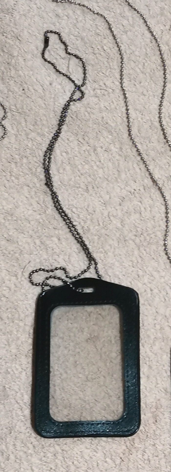 Porte badges, aspect cuir couleur noir à façade transparente, chaînette pour le cou, neufs, taille standard, 4 pièces disponibles, au choix 5 euros chacun, prix définitif, merci de confirmer votre choix à la commande.